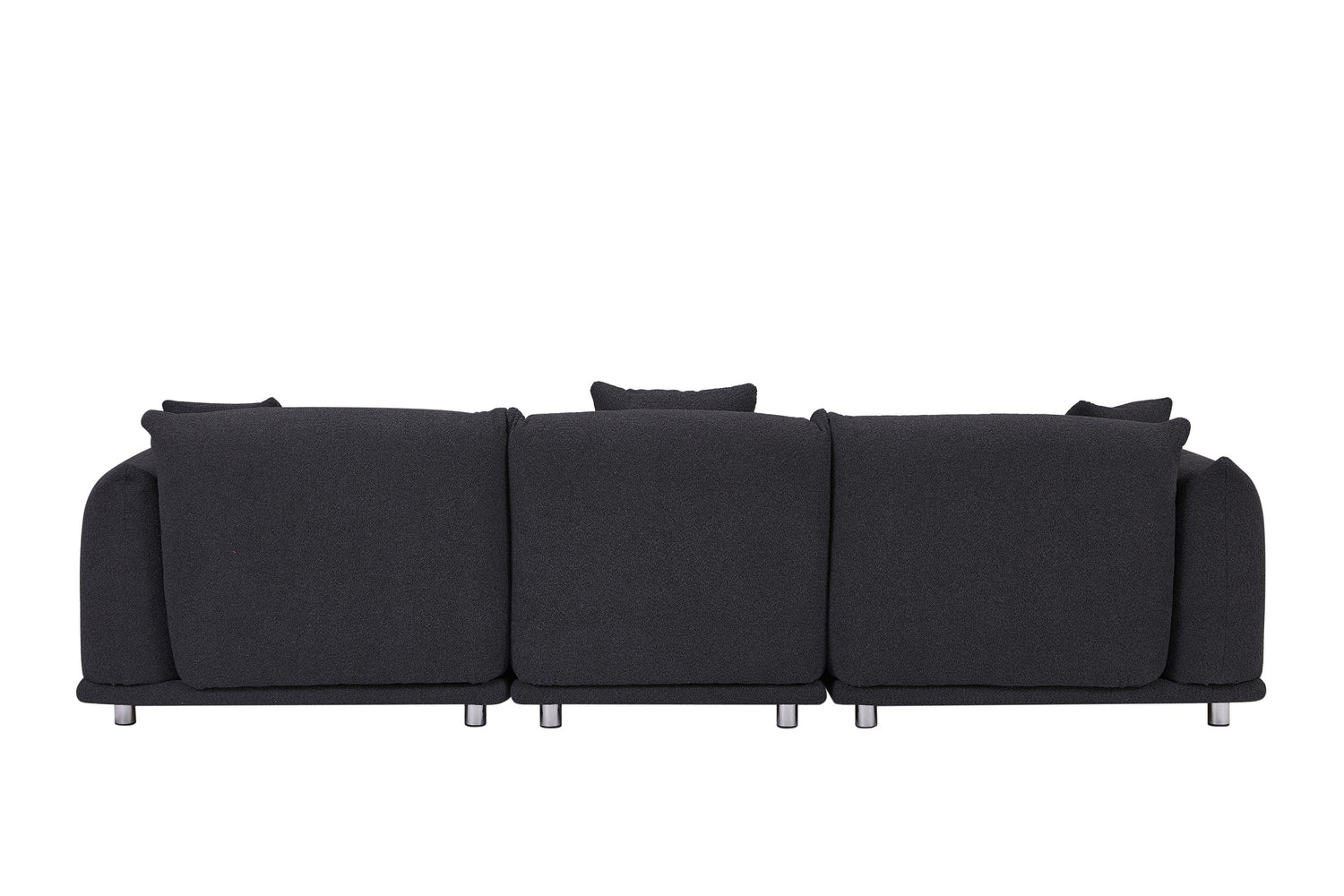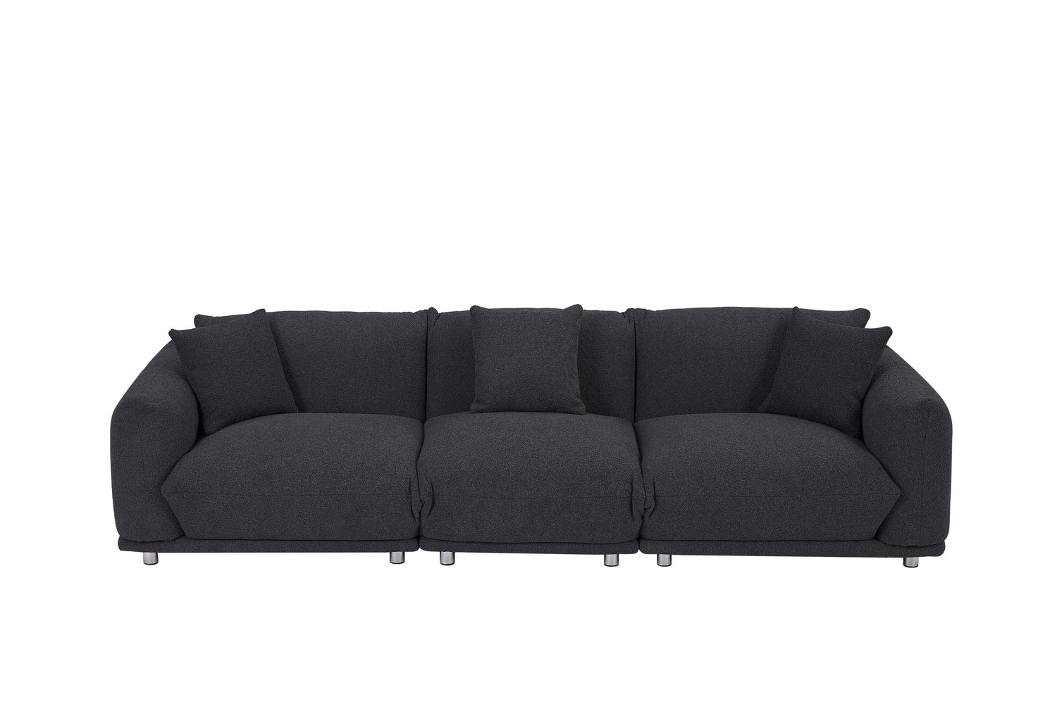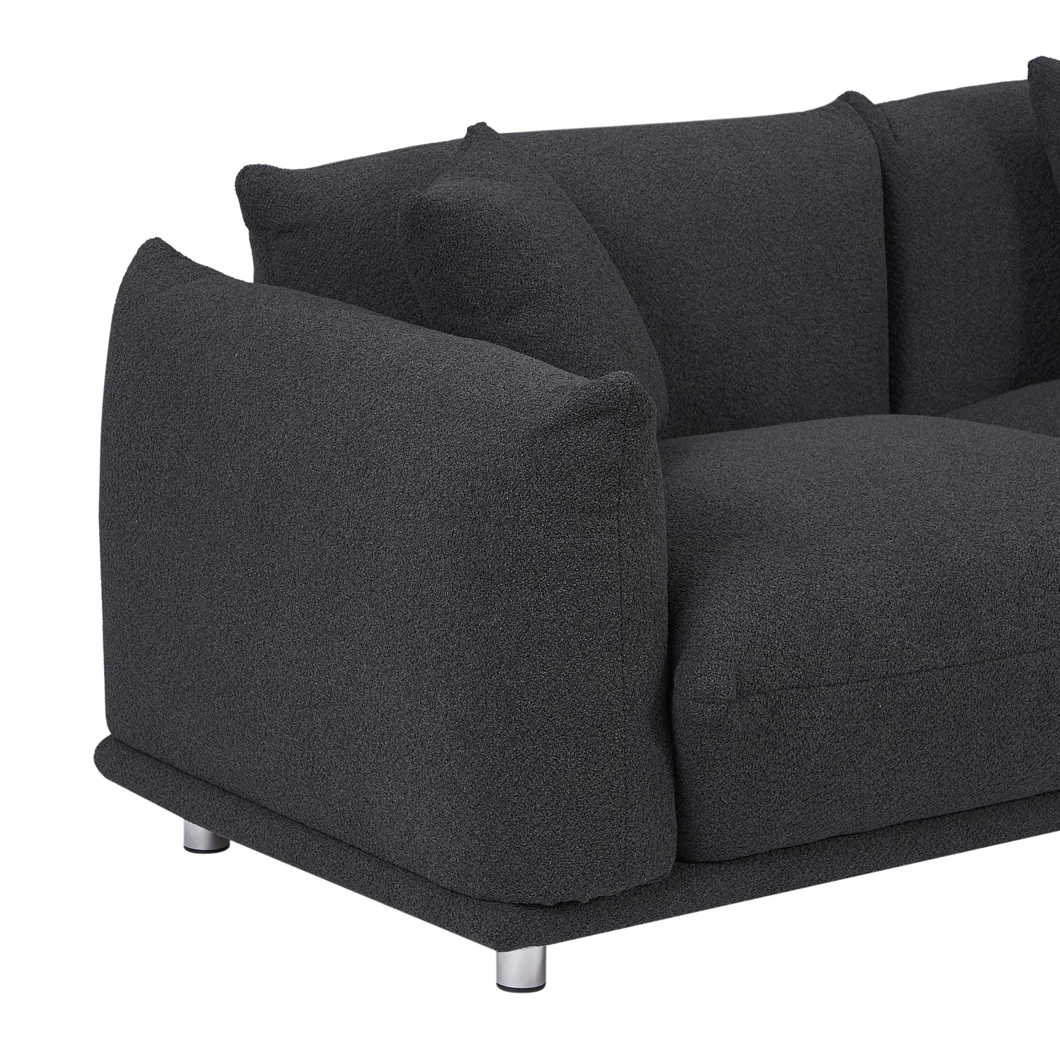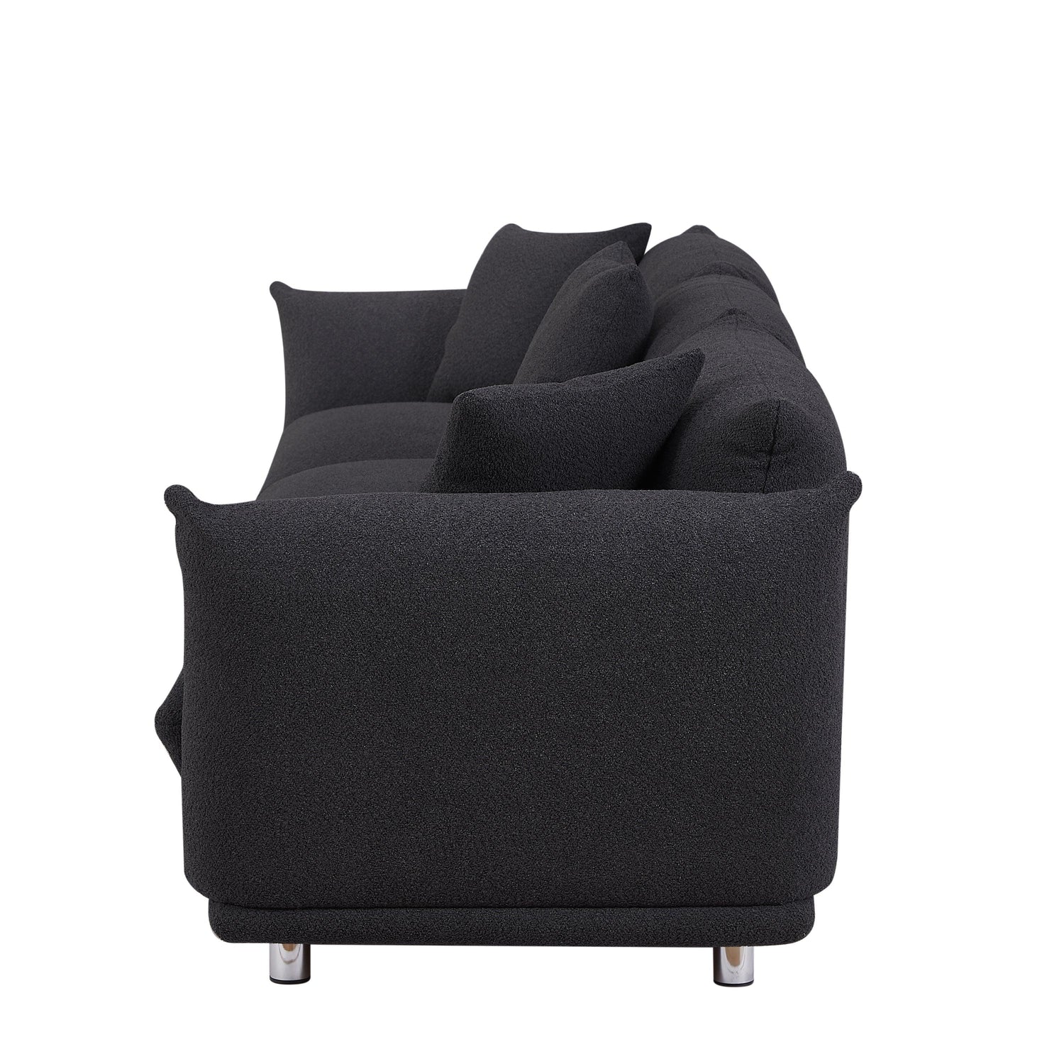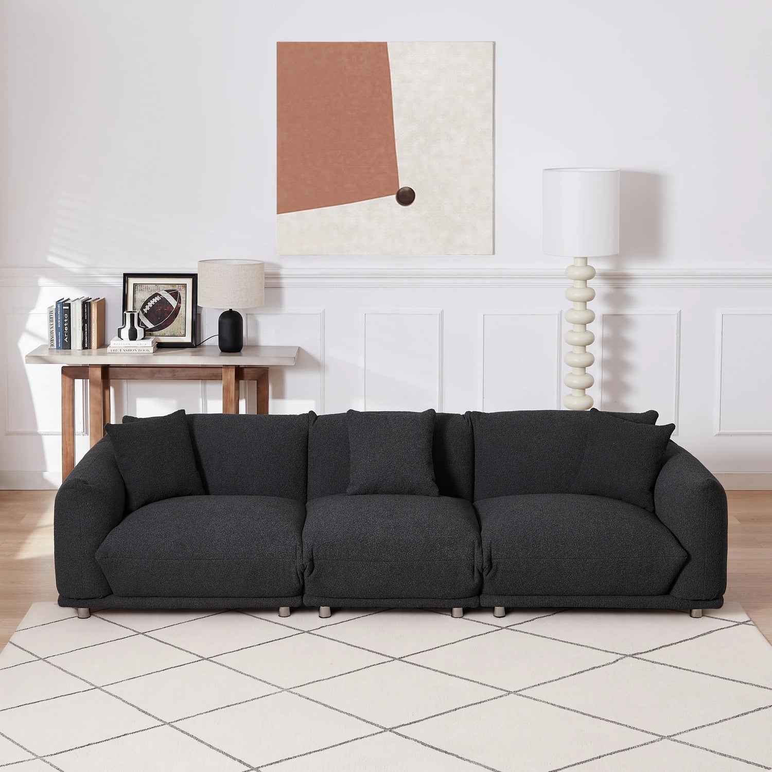 Upholstered in a textured black sherpa-like fabric over a solid wood frame and foam-filled cushions, this 4-seat sofa pairs cloud-like comfort with clean metal legs for a grounded, modern silhouette. The three loose pillows add back support and an extra relaxed aesthetic; natural variations in fabric texture and screen color may occur.
