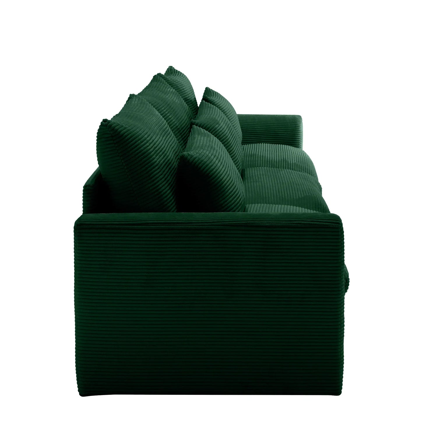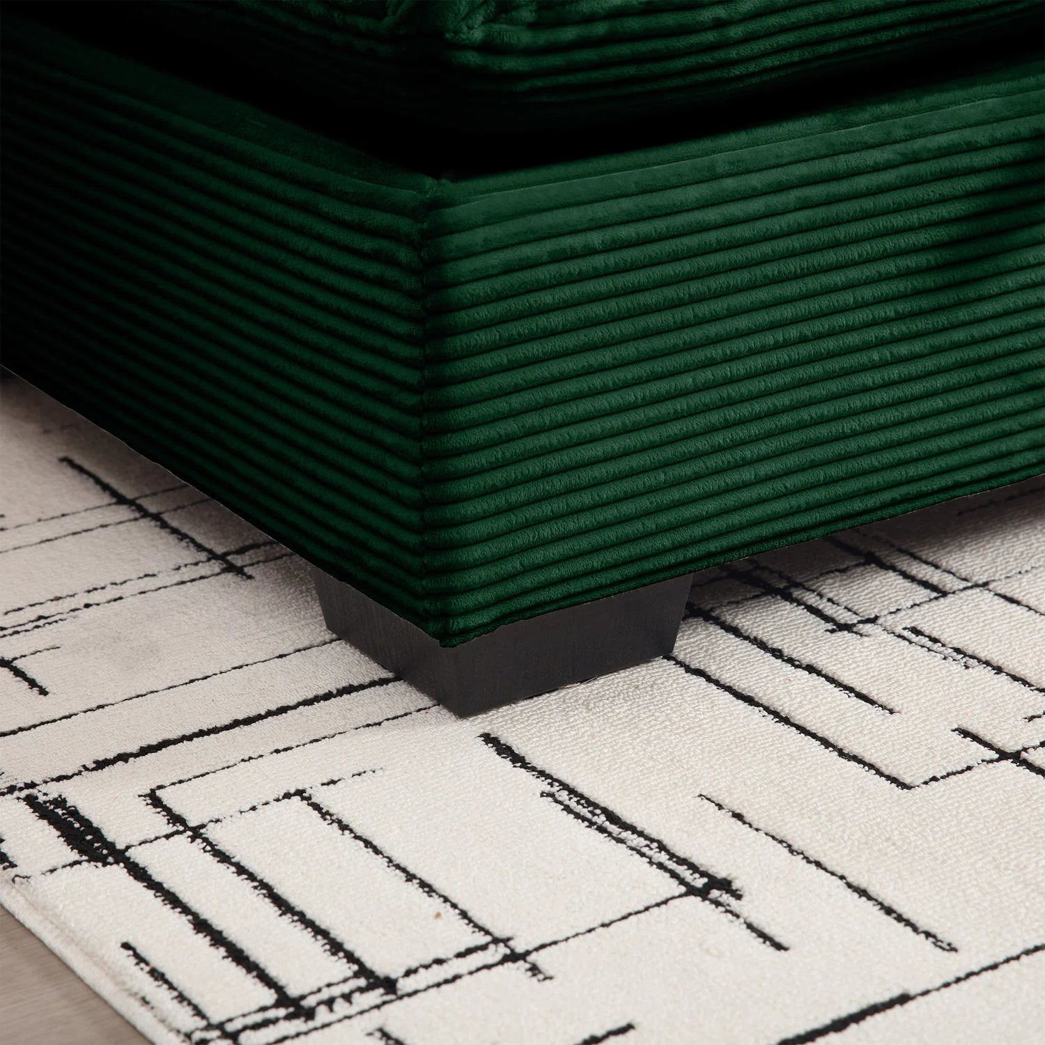 Pair with lighter, neutral rugs and brass or wood accents to let the green corduroy become the focal point. Add layered throw pillows in linen or velvet for contrast in texture, and choose coffee tables with a low profile to complement the sofa’s deep seat. Works well in living rooms sized for generous seating — combine with a low console or bench behind the sofa for added styling and function.
