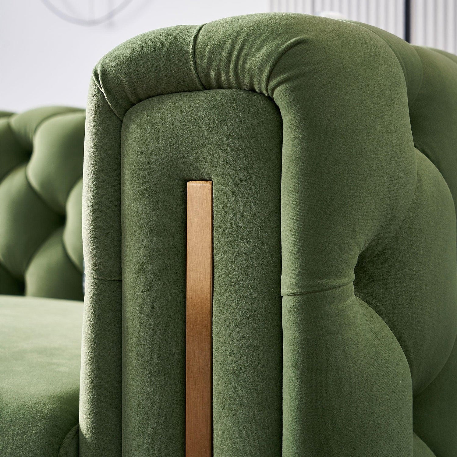 Built on a solid wood frame and upholstered in soft velvet, the sofa pairs square, structured arms with a low, tufted back for a refined yet relaxed profile. Polished metal legs and subtle vertical metal insets at the arm fronts (visible in product imagery) add a contemporary edge—making this piece equally at home in modern, mid-century, or eclectic interiors. Note: actual color and nap may vary slightly from on-screen images due to lighting and natural fabric variation.