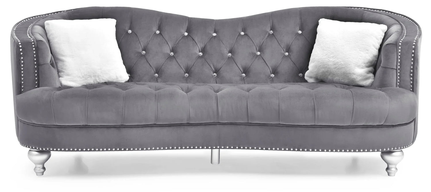 - Eye‑catching glamour: Velvet upholstery, crystal‑accent tufting and hand‑set nailhead trim make this sofa a focal point in any room.