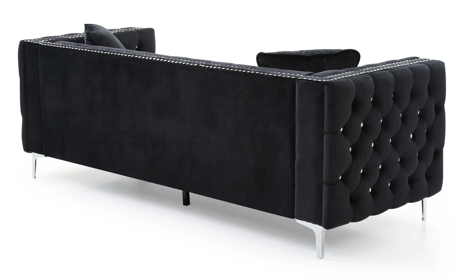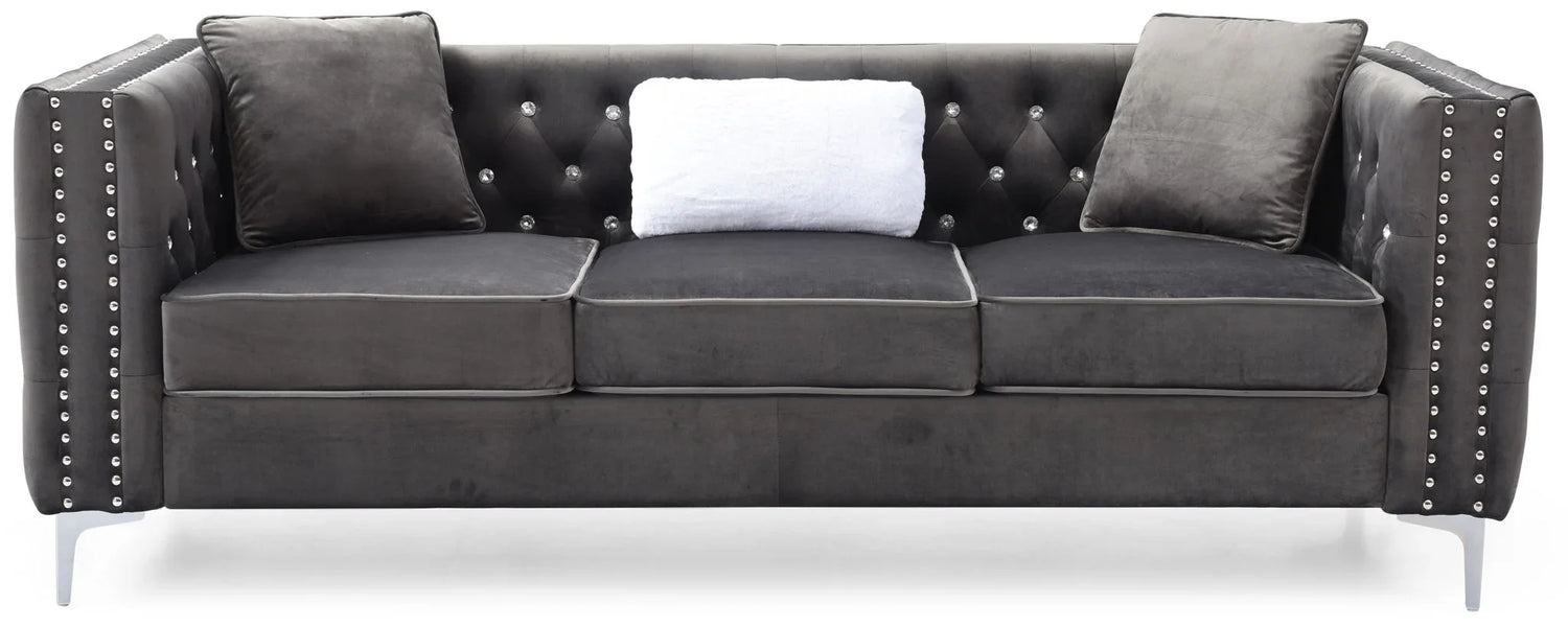 The Paige sofa is for anyone who wants glam and comfort in a compact, modern package — ideal for living rooms, lofts, or an upscale apartment where style matters as much as space. Upholstered in a rich deep charcoal-gray velvet with a subtle sheen, Paige pairs classic Chesterfield-inspired tufting with contemporary chrome legs so it reads equally well with mid‑century, modern glam, or transitional décor.