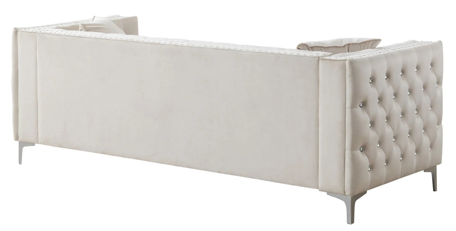 Designed for everyday lounging and elegant entertaining, Paige features deep button tufting with faux-diamond accents and polished stud detailing along the arms for a luxe, tailored look. Its unique KD (knock‑down) design lets the sofa be delivered into tighter rooms and narrow stairwells, then set up in place — a practical touch that keeps installation simple without compromising on presence.
