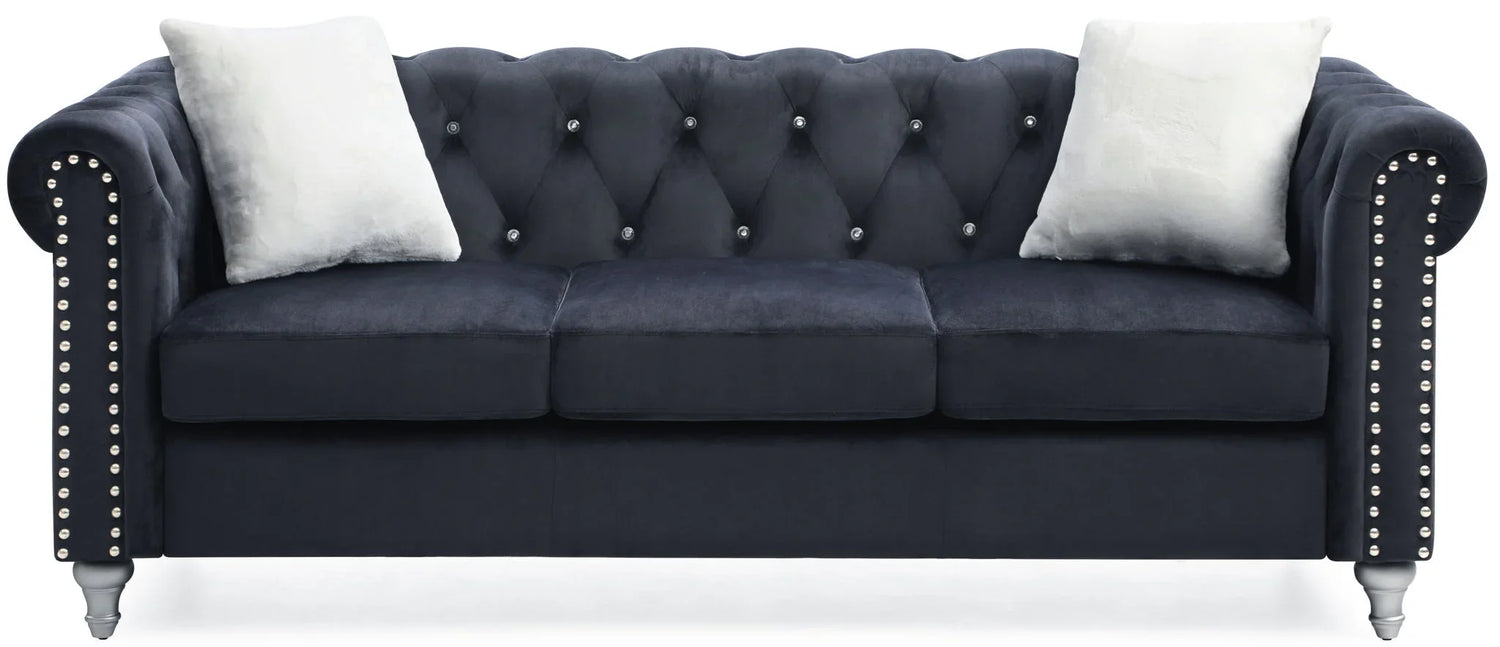 The Raisa sofa brings timeless glamour to a modern living room—ideal for anyone who wants a statement piece that still feels approachable. Designed for everyday lounging and elegant entertaining, its plush micro-suede velvet invites you to sit while the faux-jeweled tufting and hand-applied nailhead trim make the piece a focal point in contemporary, transitional, or Hollywood-regency interiors.