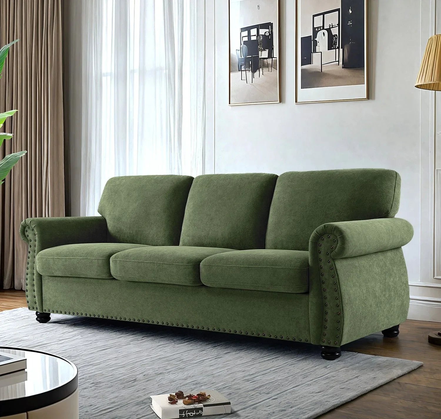 Soft Sofa, Upholstered 3 Seater Couch, Loose Back Cushions And Turned Legs - Green