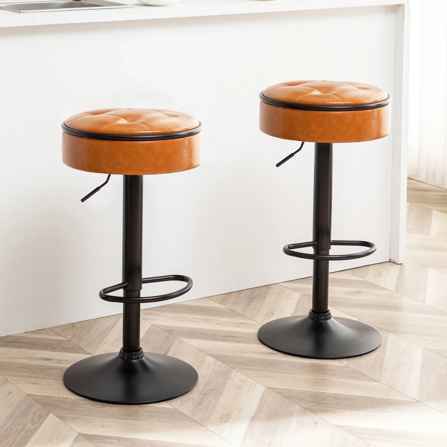 Each stool pairs dense foam padding and button-tufted detailing with a matte black metal pedestal, a built-in footrest and a discreet height-adjust lever for quick, tool-free adjustments. The clean silhouette, warm cognac-like brown and matte black base read as mid-century modern meets industrial — stylish enough for social gatherings, sturdy enough for daily use.