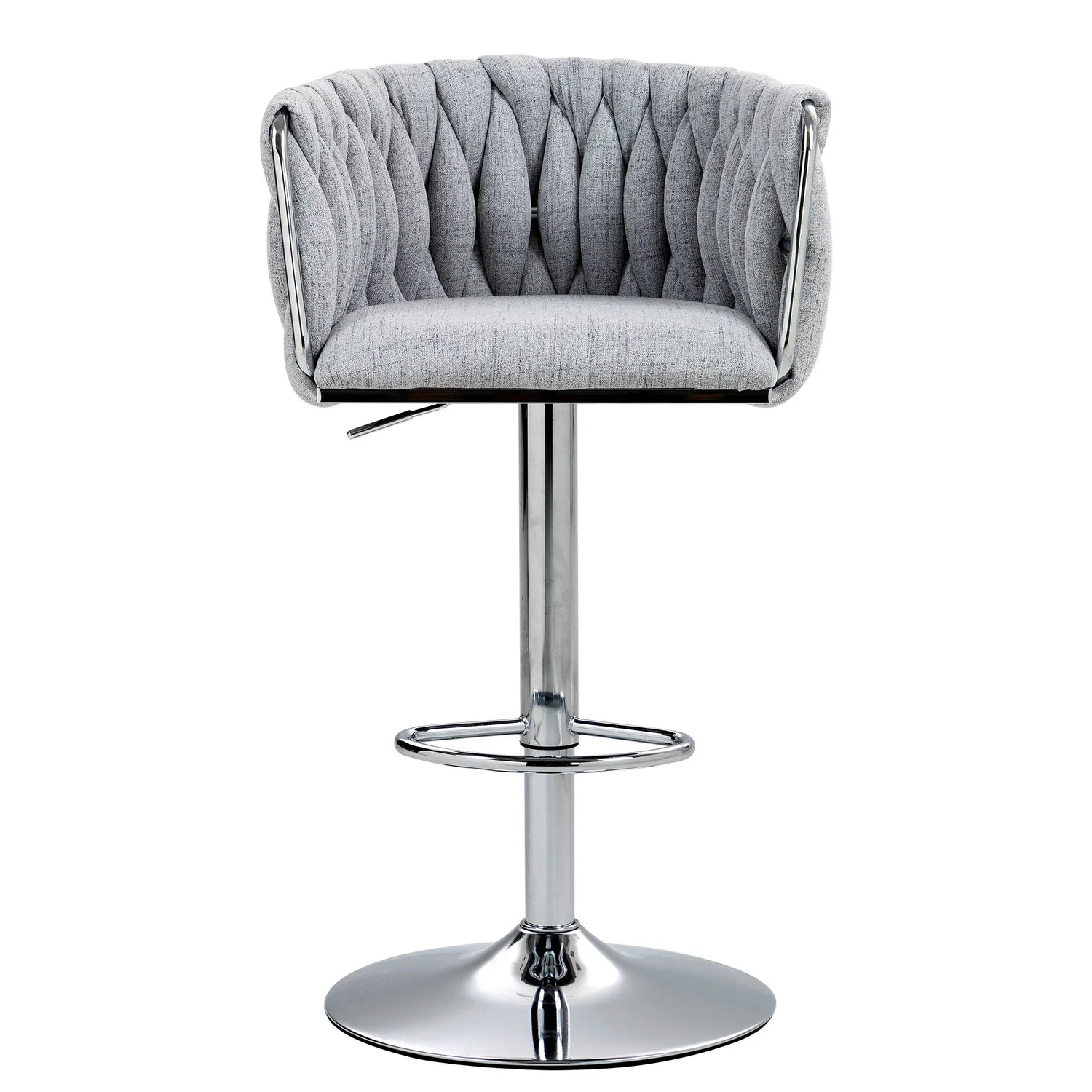 Everyday practicality is built in: a gas-lift height adjuster adapts the seat to different counter or bar heights, while a full swivel gives passengers freedom of movement. The textured gray woven upholstery and tufted-like stitch pattern add visual depth, and a sturdy chrome base with anti-skid protection keeps the stool stable on hard floors. These stools arrive as a two-piece set with simple assembly and tools included.