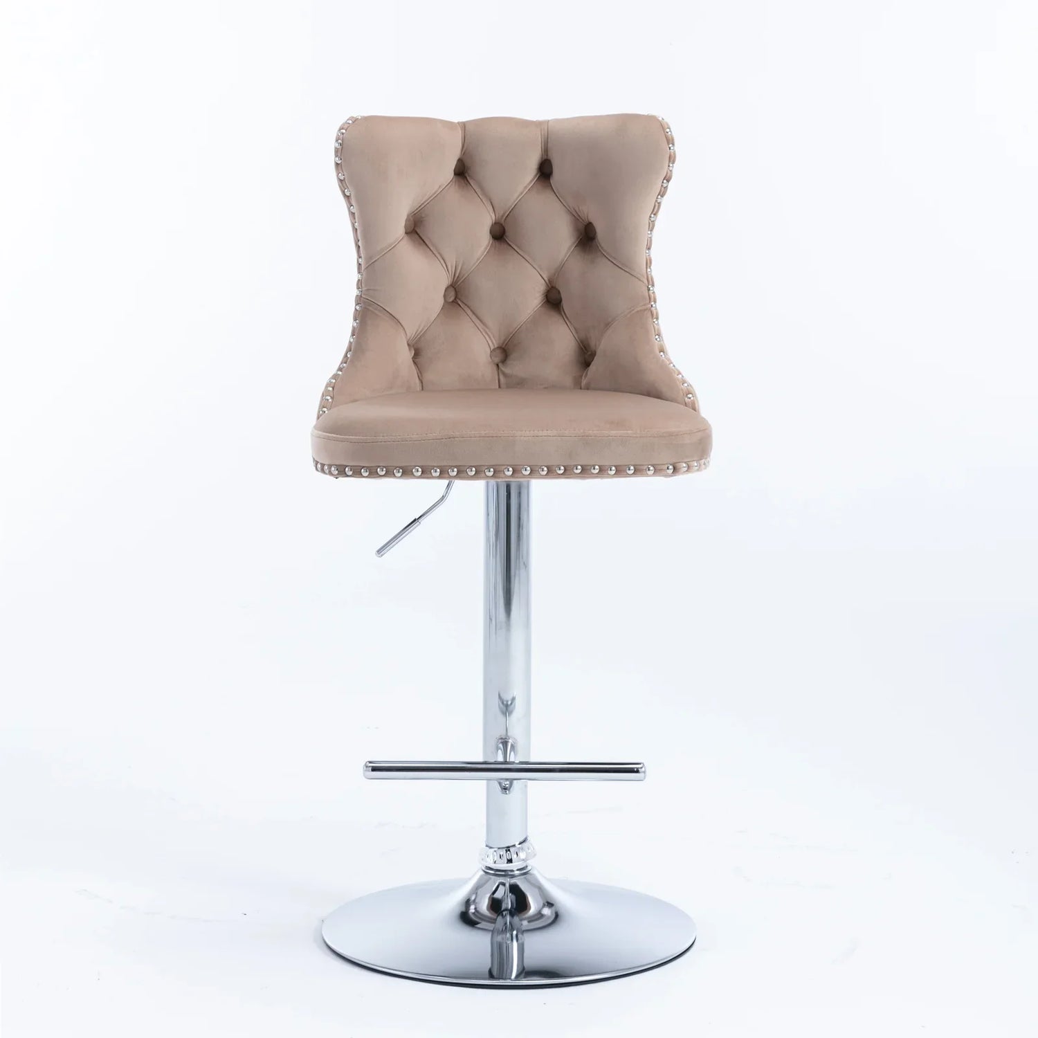 Perfect for a kitchen island, home bar, or contemporary dining nook, this tufted swivel bar stool pairs comfortable seating with a polished, modern silhouette. Designed for people who want a dressy yet everyday piece, the khaki velvet upholstery and chrome base bring a refined, hotel-style look that works in modern, transitional, or glam interiors.