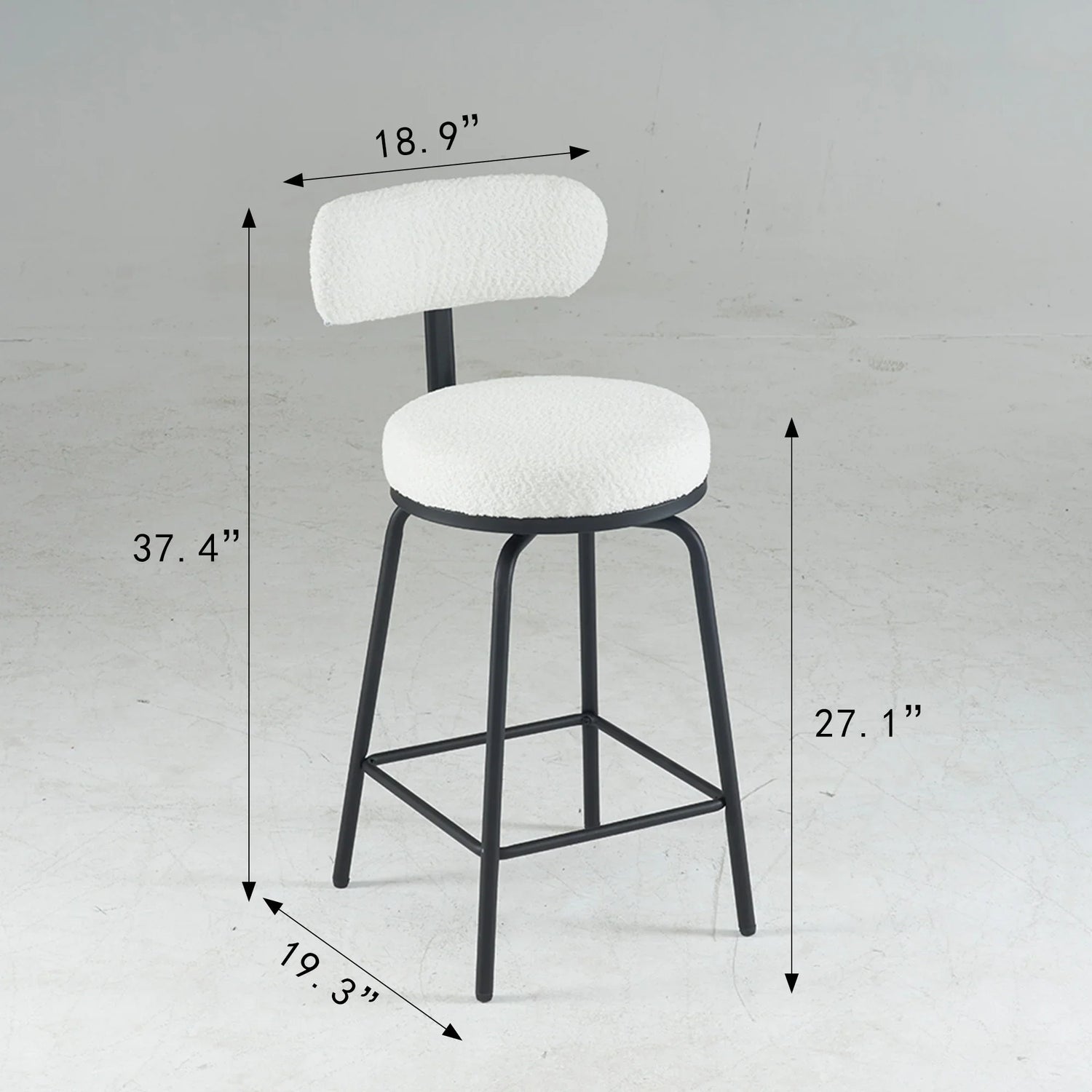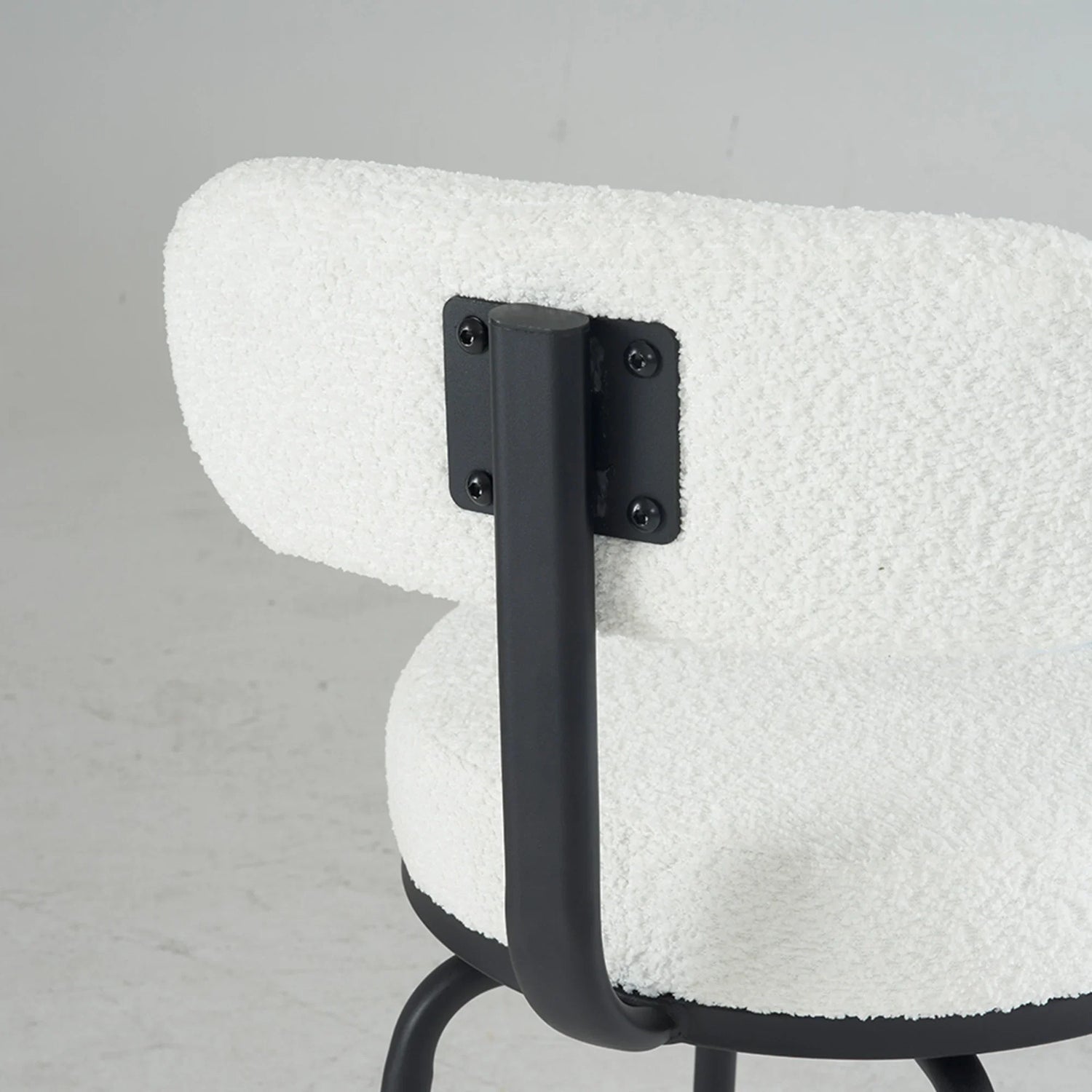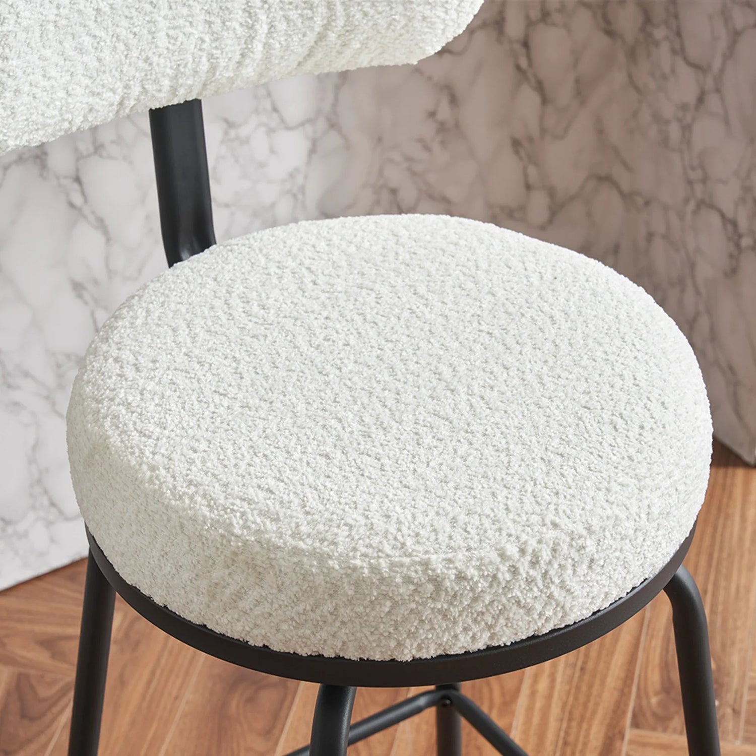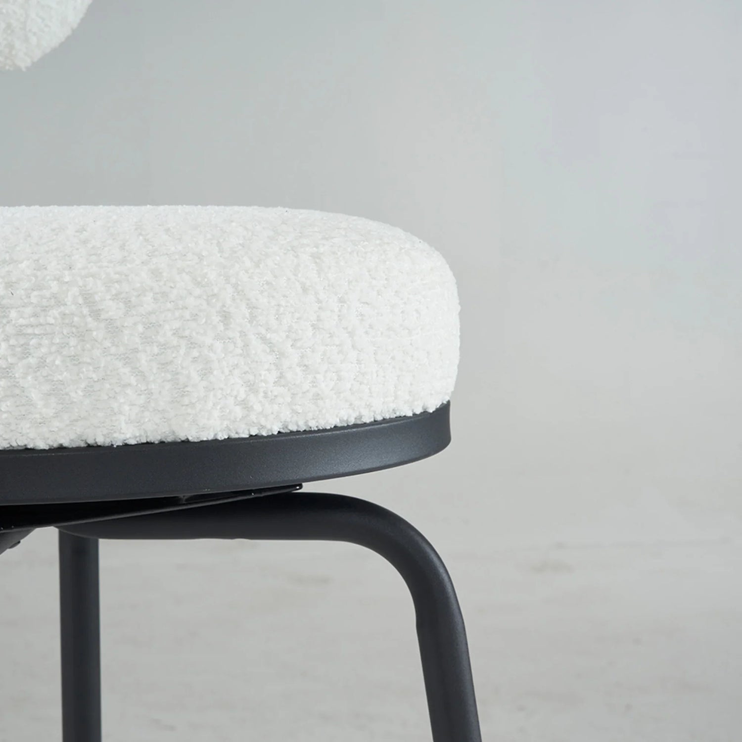 Built with a full 360° swivel and a rounded, cushion-forward silhouette, the stool offers easy movement and approachable comfort without taking up visual space. The boucle-like textured fabric and matte metal legs create a contemporary look that pairs well with marble, wood, or laminate counters; natural materials and screen settings may cause slight color and texture variation.