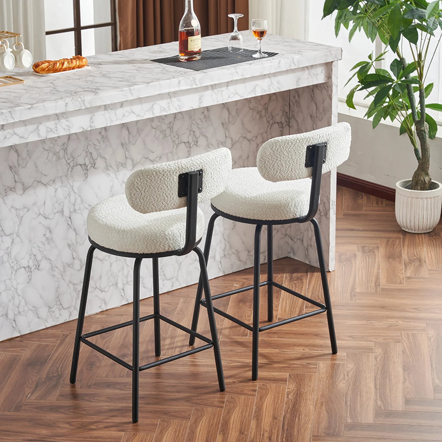 Perfect for apartments, kitchen islands, or casual home bars, this counter-height swivel bar stool blends modern simplicity with everyday comfort. Upholstered in a soft white fabric over high-density foam and supported by a slim metal frame, it’s designed for people who want a compact, stylish seat that’s as at ease during morning coffee as it is for evening guests.