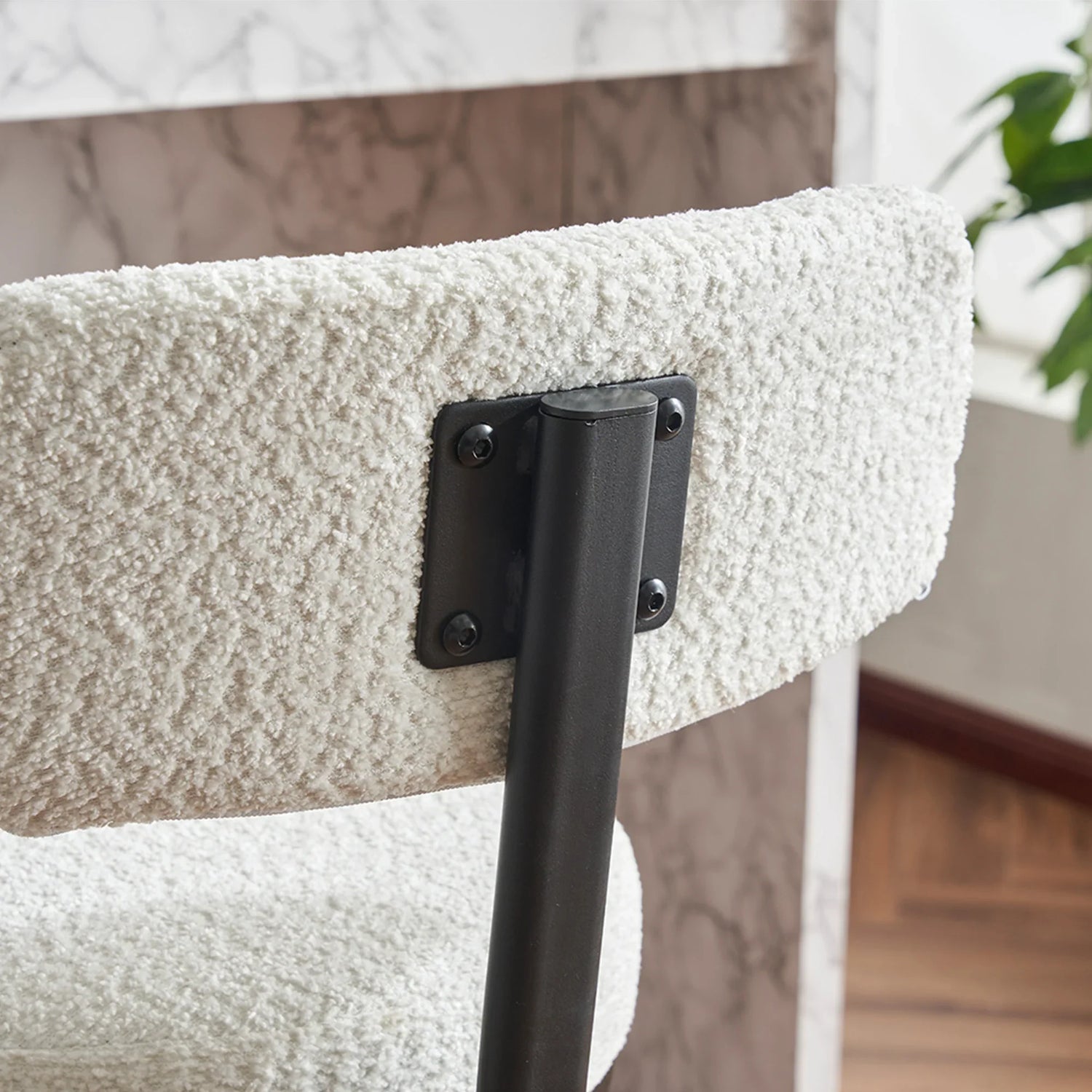 Pair with a light marble or warm wood counter to highlight the white upholstery and matte metal legs. Works well in modern, Scandinavian, or minimalist kitchens—add a textured rug underfoot and pendant lighting overhead to complete the look.