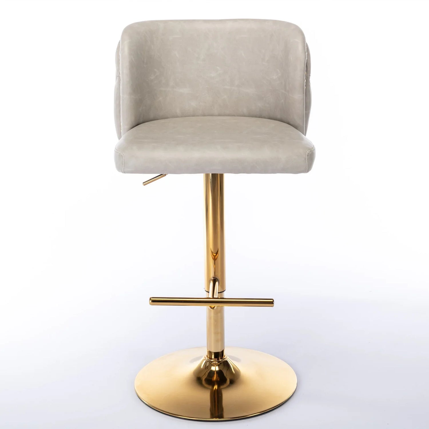 Upholstered in soft beige PU leather with button-tufted back detailing and a polished gold-tone pedestal base, the stool reads luxe without high maintenance. A 360° swivel makes access easy from any angle, and the integrated footrest keeps posture relaxed during extended use. Visible stud accents and stitched seams add tailored finishing touches that elevate a contemporary or transitional interior.