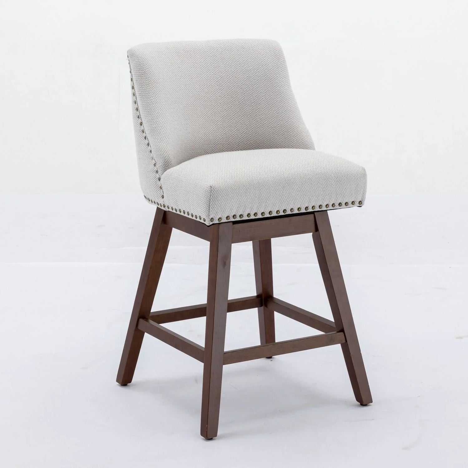 Upholstered in a soft ivory textured fabric with decorative studding and set on a sturdy dark‑brown wood base, these stools balance transitional warmth with modern utility. The compact footprint and 26" (66.0 cm) seat height make them a natural fit at standard counter surfaces; screens and natural materials may show slight color and grain variation.