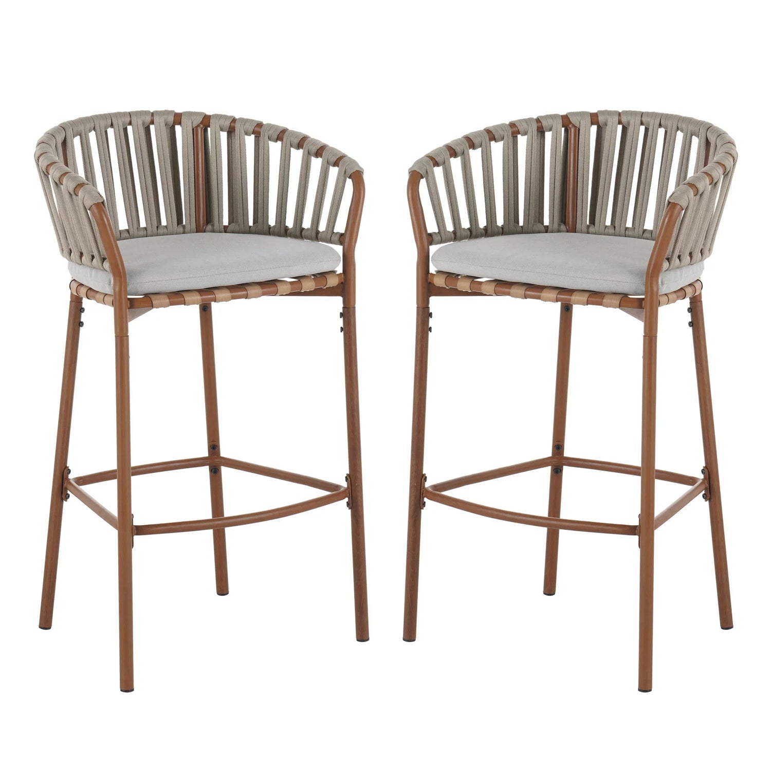 Lodi - Outdoor Matal Rope Barstool, Teak / Beige (Set of 2) - Teak / Beige