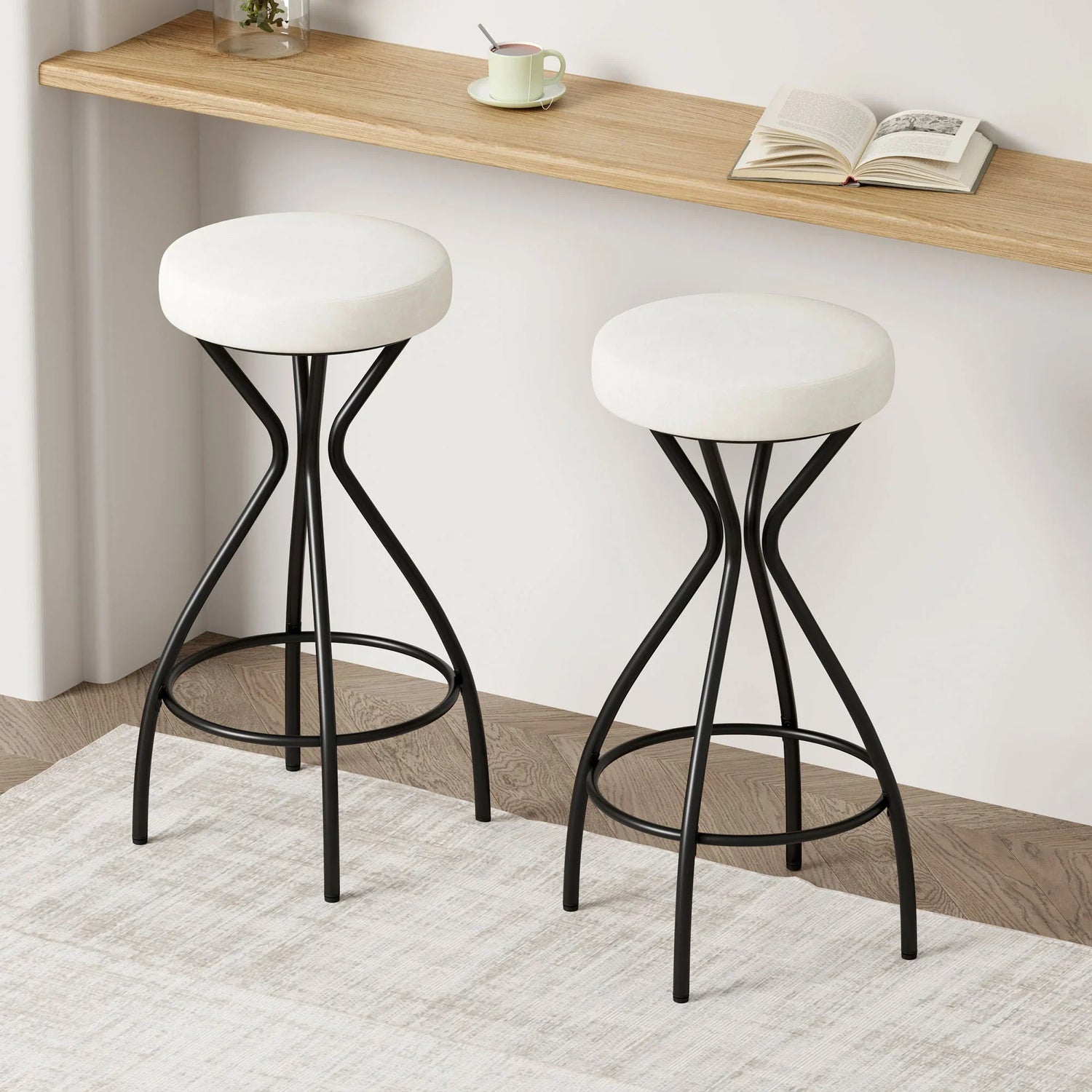 - Stylish Set of 2 Bar Stools: Elevate your kitchen or bar area with this modern set of 2 backless bar stools featuring a sleek power-coated frame and a plush, round velvet seat in creamy for a touch of elegance.