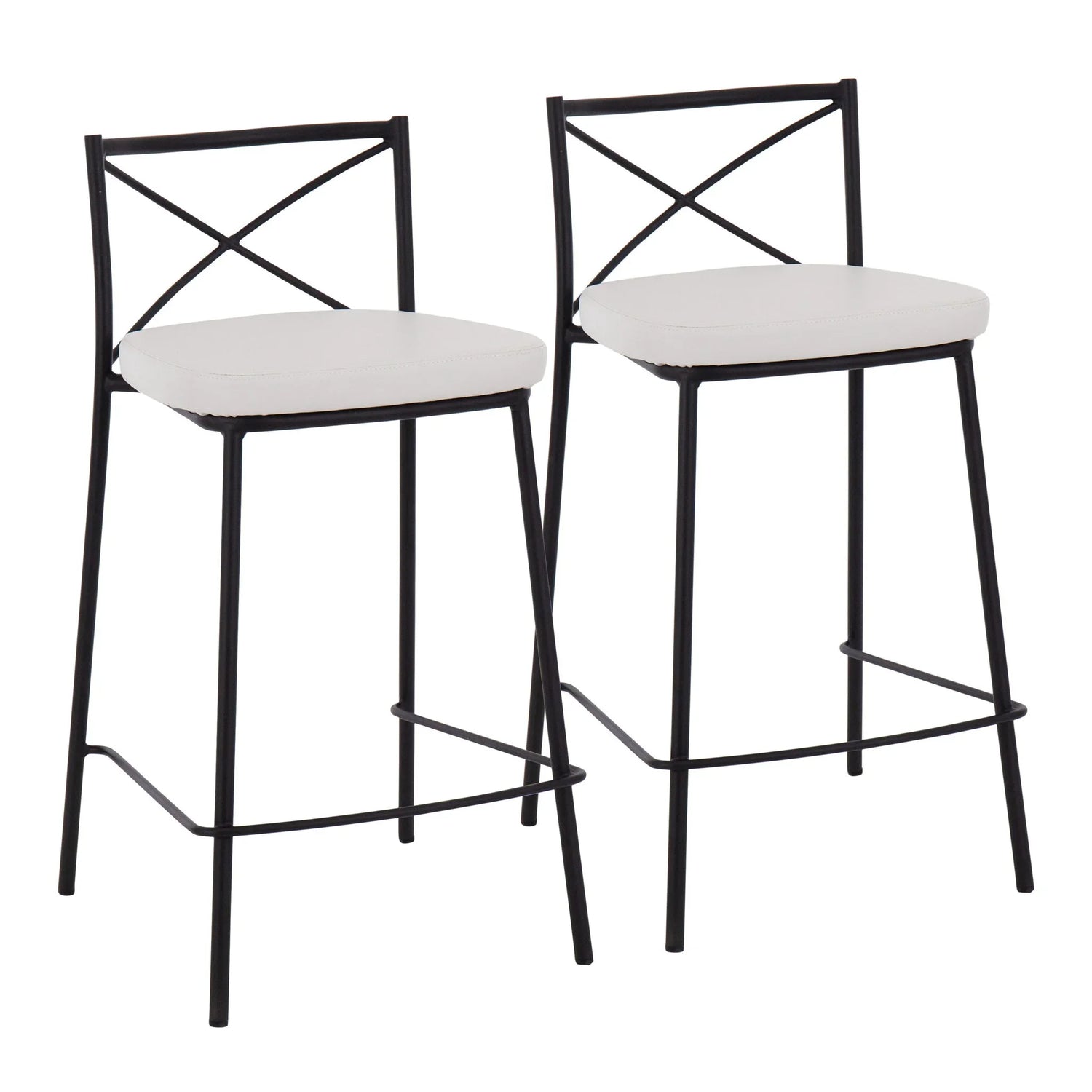 Each stool pairs a polished gold-tone metal frame with a cushioned faux leather seat and a signature X-shaped backrest—a modern-contemporary mix that reads both refined and approachable. The slim metal legs and integrated footrest keep the profile light while the full back gives reliable support for longer chats at the counter. Assembly is required for quick at-home setup.