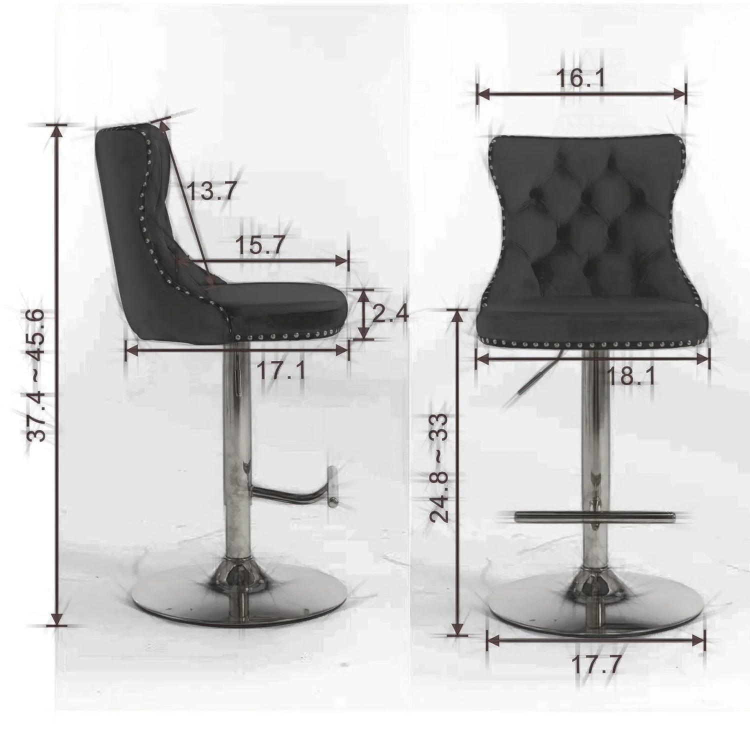 Built on a chrome pedestal with a round base and a built‑in footrest, these stools offer 360° swivel and a gas‑lift lever that adjusts the seat height from 25" to 33" (63.5 cm–83.8 cm). Visible tufting and decorative nailhead trim give a tailored, contemporary look that complements modern and transitional kitchens alike.