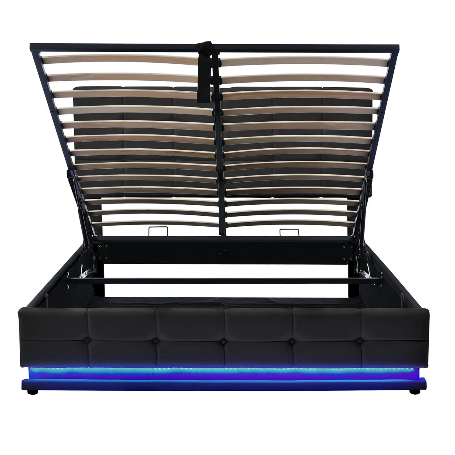 - Enhance your bedroom with this modern bed, featuring a tufted headboard surrounded by customizable LED lighting. With 16 million colors, adjustable temperature, brightness, and timing settings, the LED lights create the perfect ambiance, with options like Strobe, Gradient, and Jump, plus light syncing with music or games for immersive experiences. Constructed from solid MDF and plywood, the bed frame supports up to 600 lbs, ensuring durability and stability. For added convenience, built-in USB charging ports allow you to easily power up your devices. A hydraulic storage system beneath the mattress offers ample space for quilts, sheets, and other essentials, combining functionality with style.