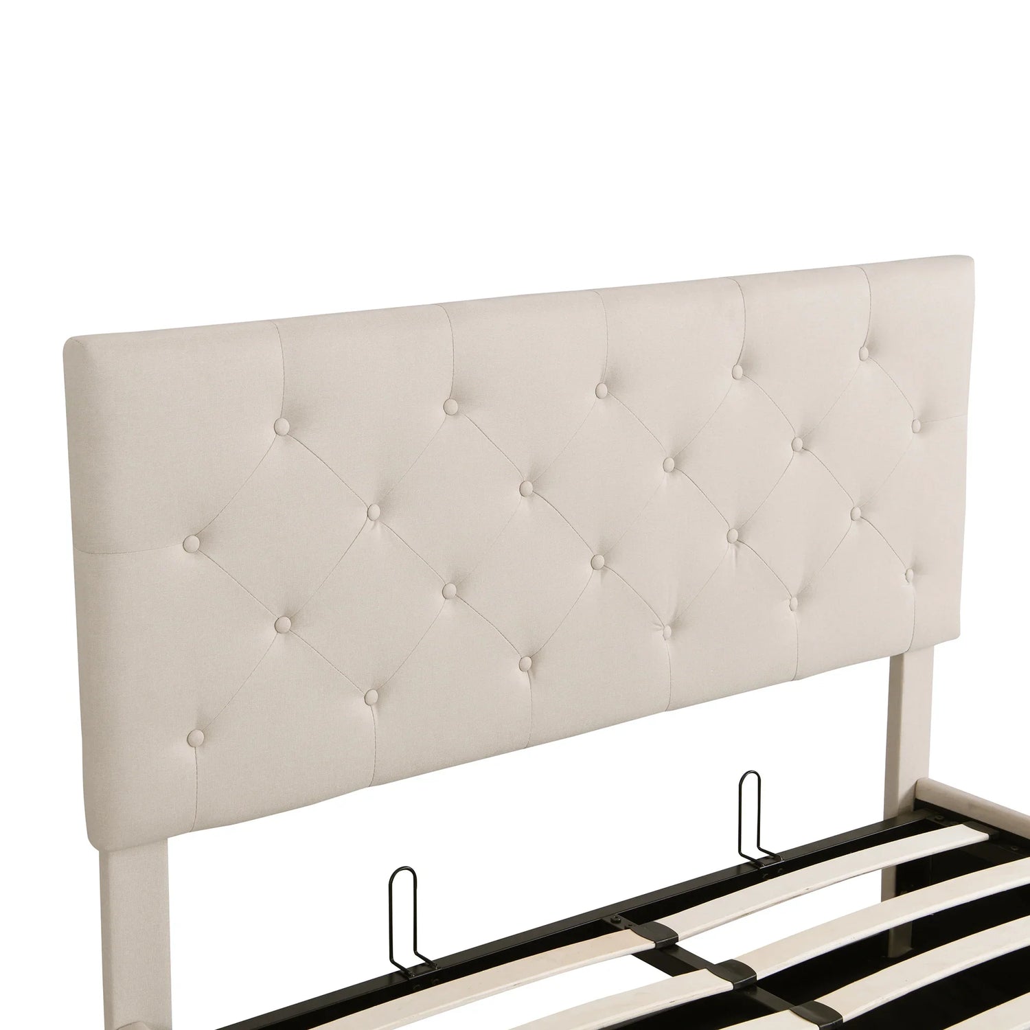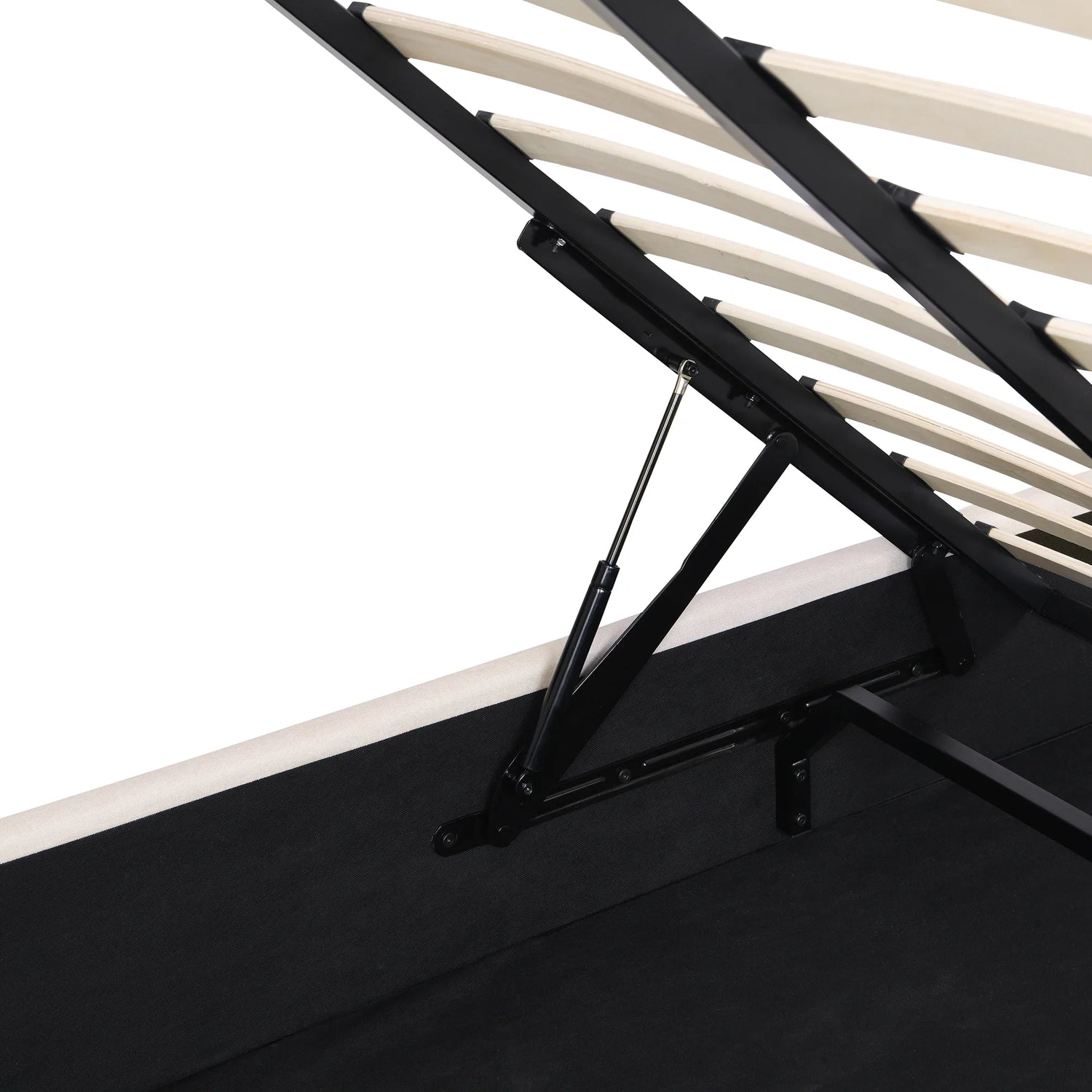 - Maximize bedroom storage with this elegant platform bed, featuring a convenient hydraulic storage system beneath the mattress, which is ideal for quilts, sheets, and other essentials. Upholstered in carefully selected linen fabric with decorative details, this bed combines functionality with timeless elegance. The soft textile headboard enhances coziness, while the versatile design complements any decor. Constructed from solid pine wood and plywood, this bed supports up to 400 lbs, ensuring durability and stability. With 24 reinforced slats, it eliminates the need for a box spring, offering even weight distribution for restful sleep. The included headboard provides a comfortable linen fabric backrest. Dimensions: 77.9 x 58.8 x (44.6 or 48.6) inches.