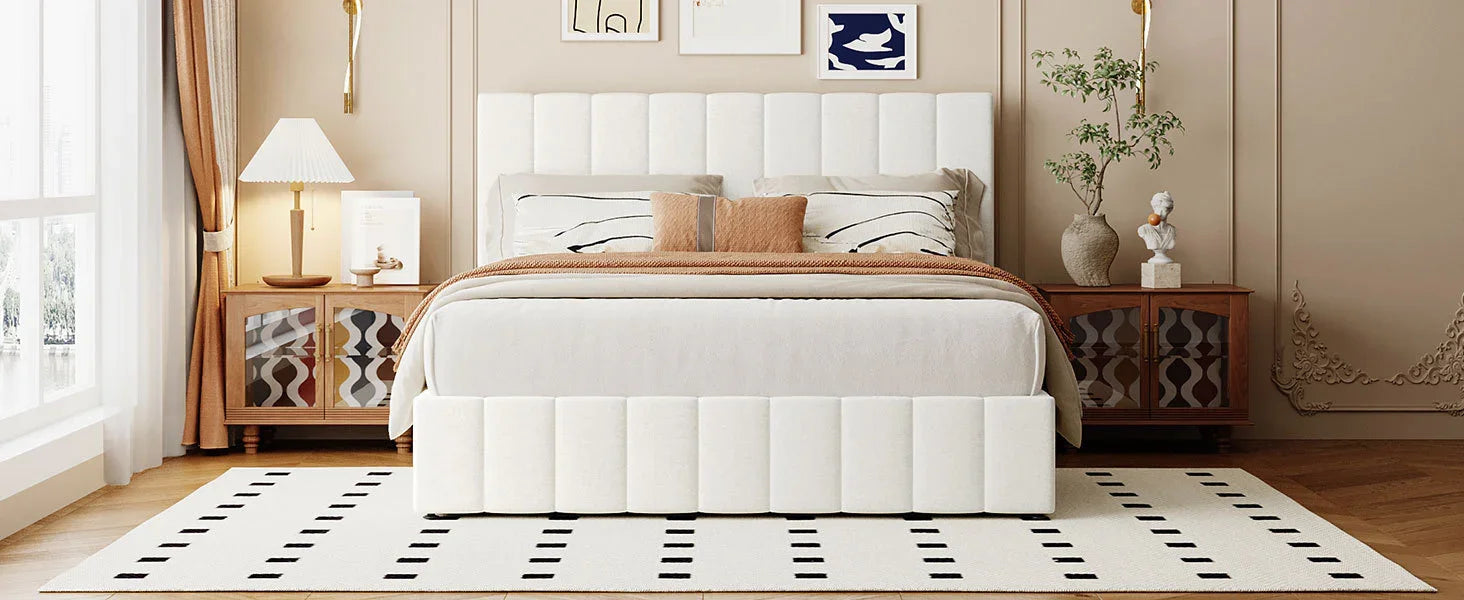- [Elegant Design] Upholstered in carefully-selected linen fabric, in elegant beige, and with docorative details, this platform bed not only suits any home décor, but is timeless in its design. The soft textile bedhead creates coziness, while the single color of the design creates versatility.