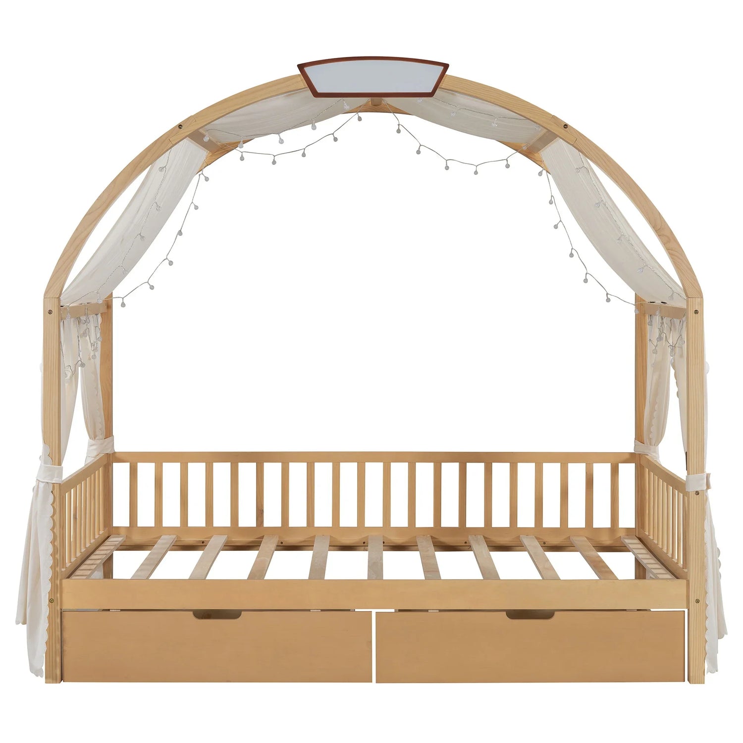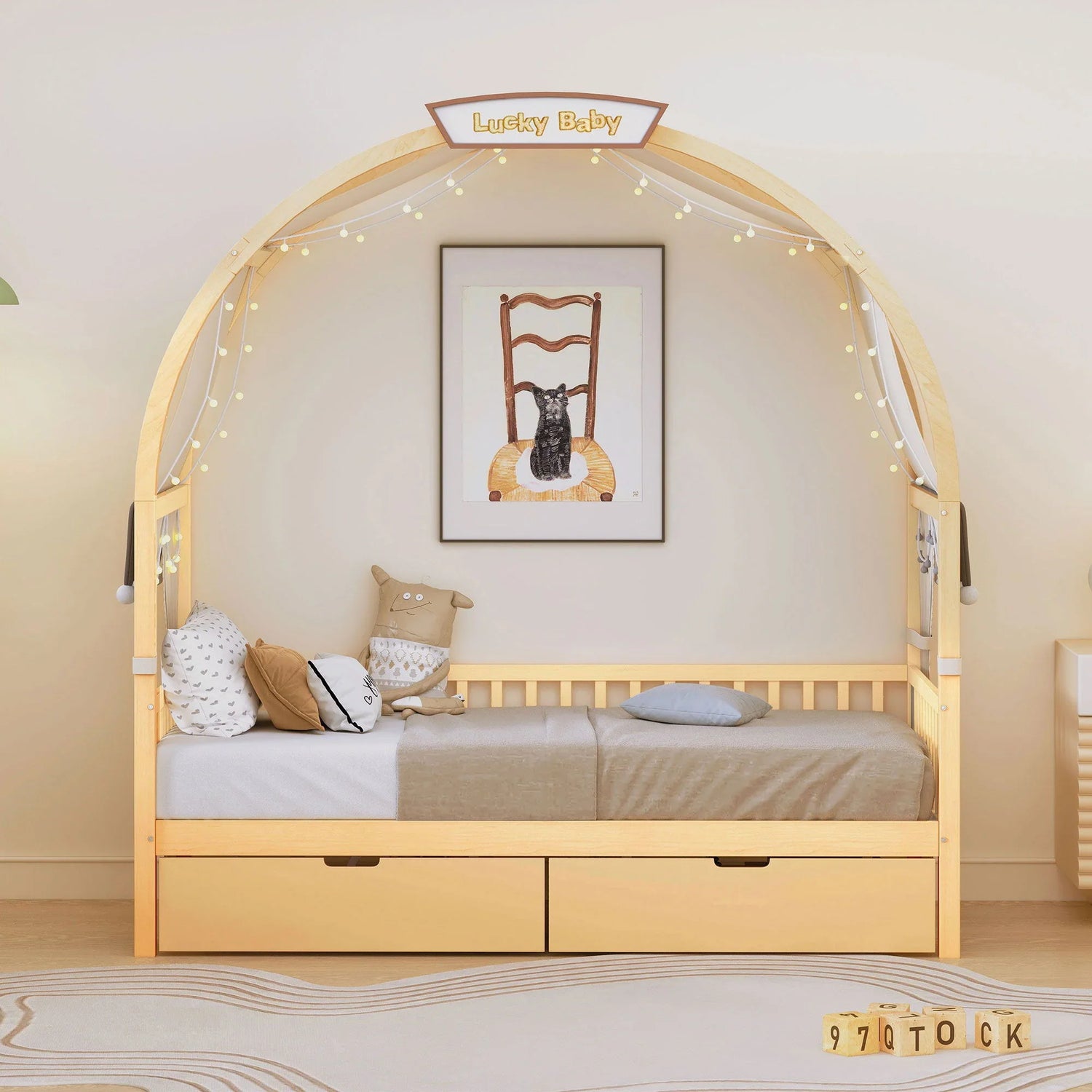 Twin Size Bed With Arched Roof And 2 Drawers - Natural