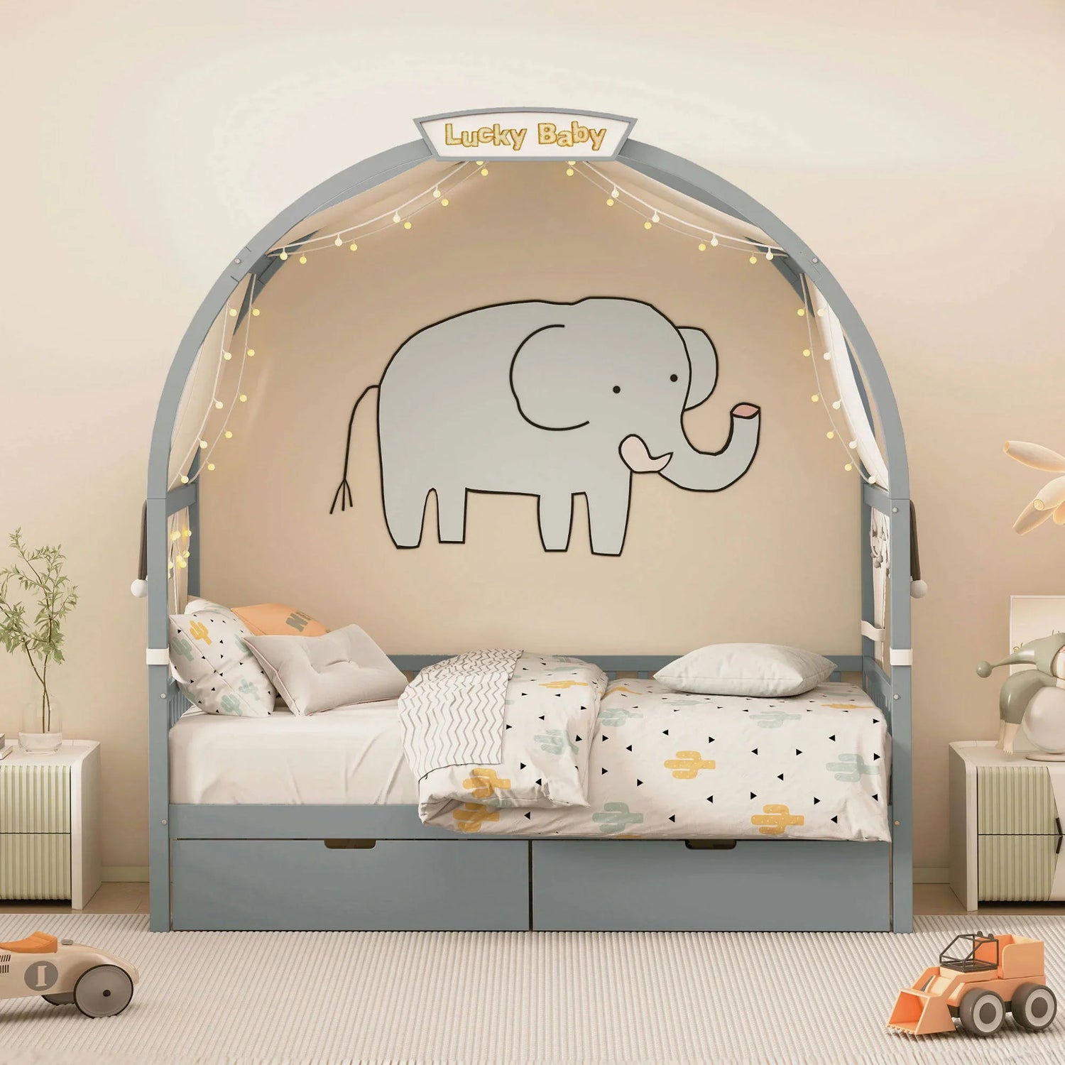 Twin Size Bed With Arched Roof And 2 Drawers - Gray