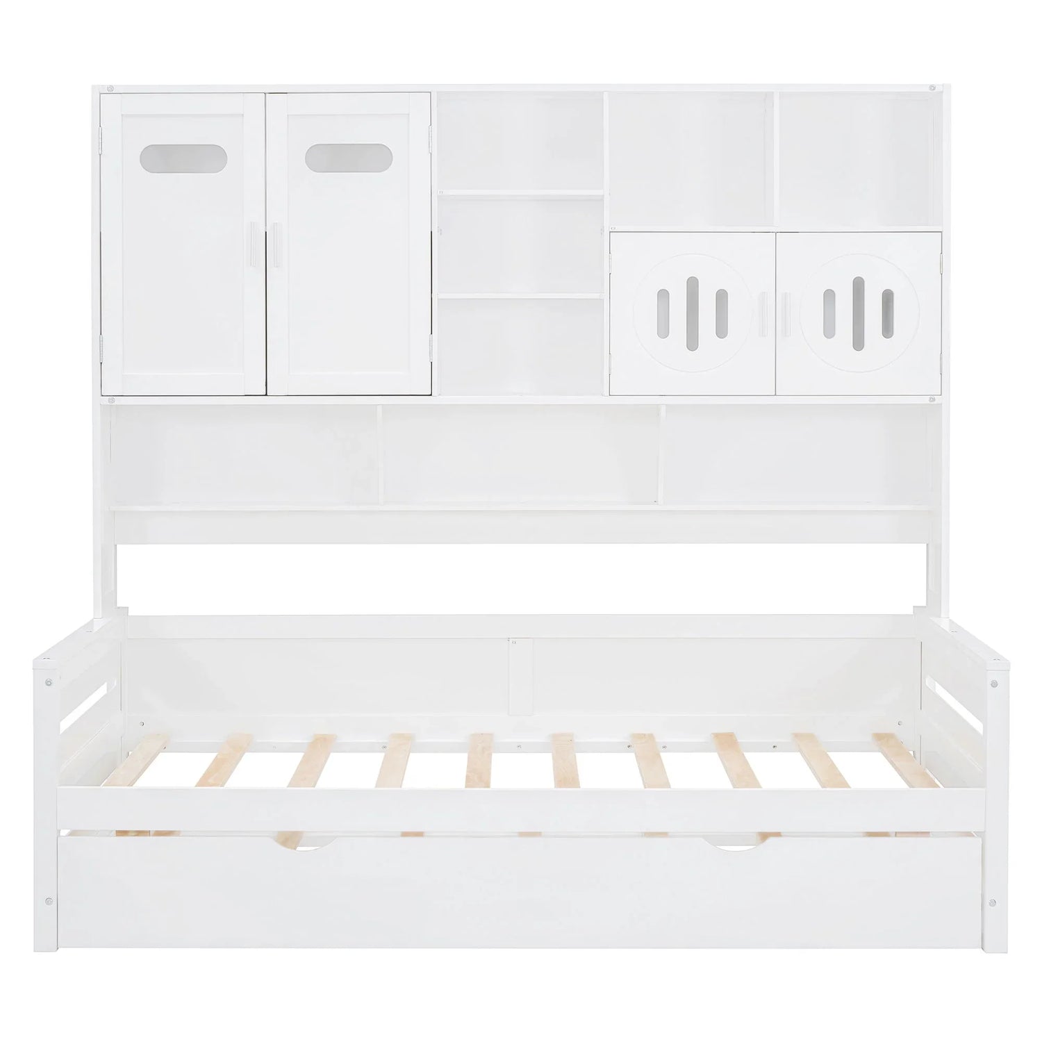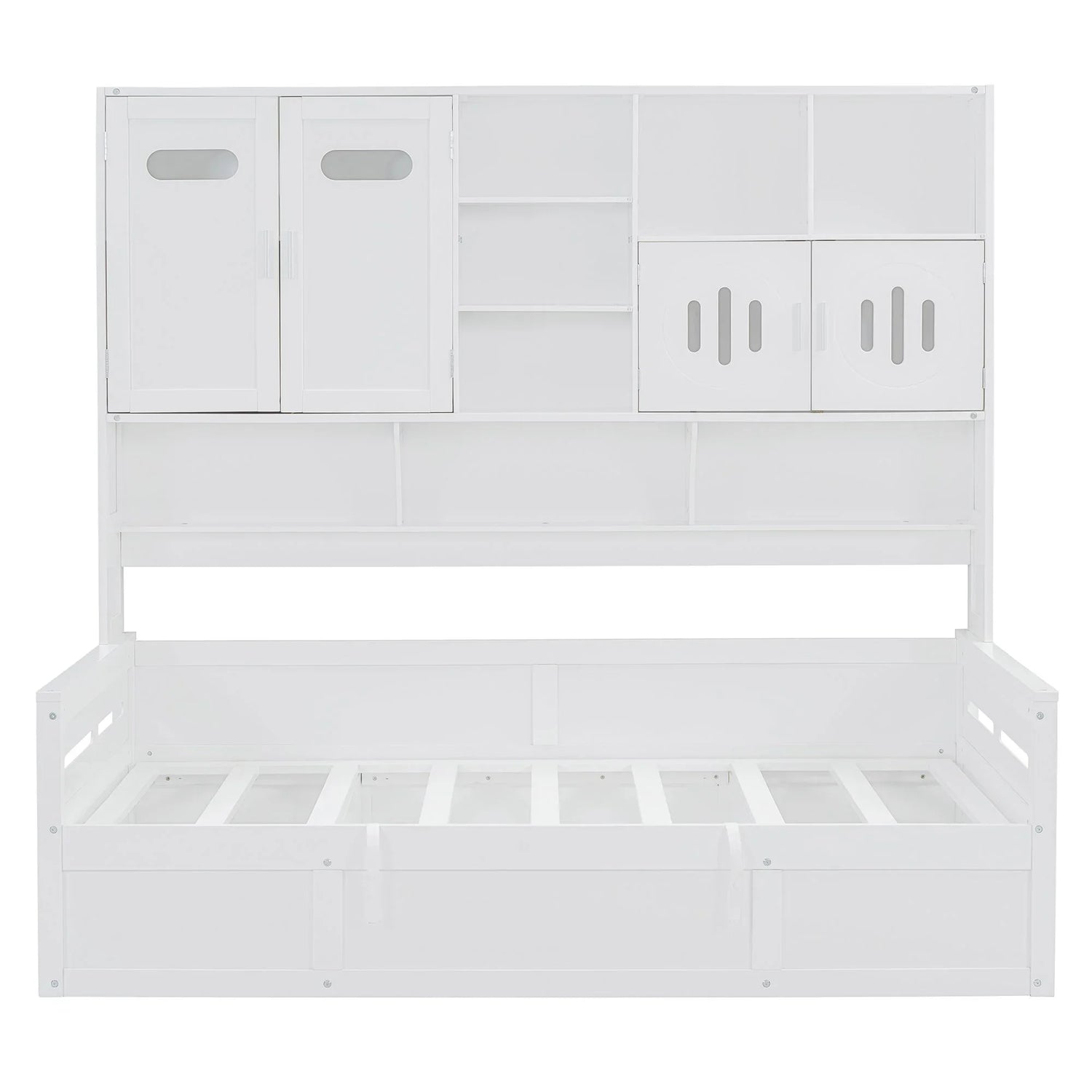 Twin Size Wooden Daybed With Twin Size Trundle, And All In One Cabinet And Shelf - White