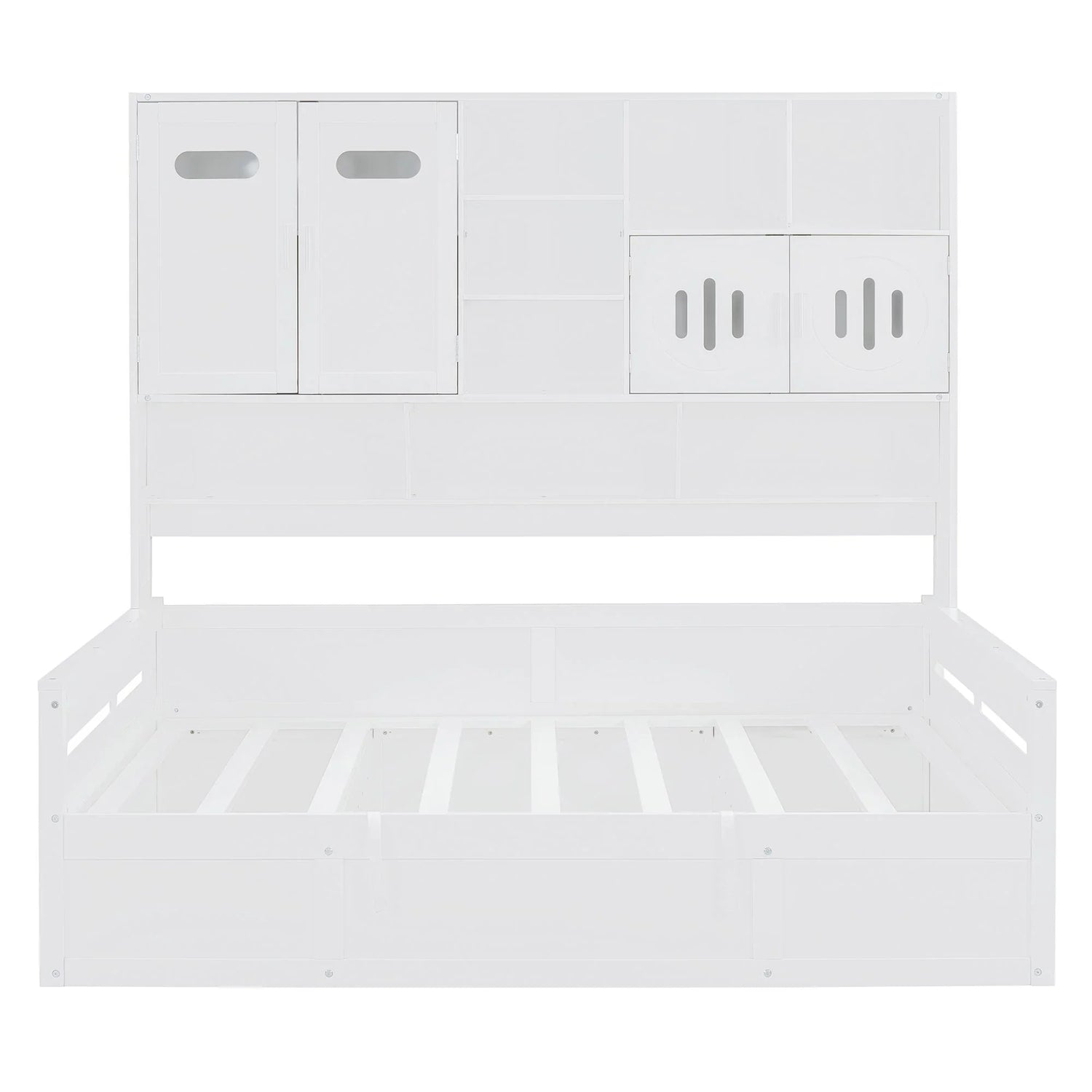 Full Size Wooden Daybed With Twin Size Trundle, And All In One Cabinet And Shelf - White