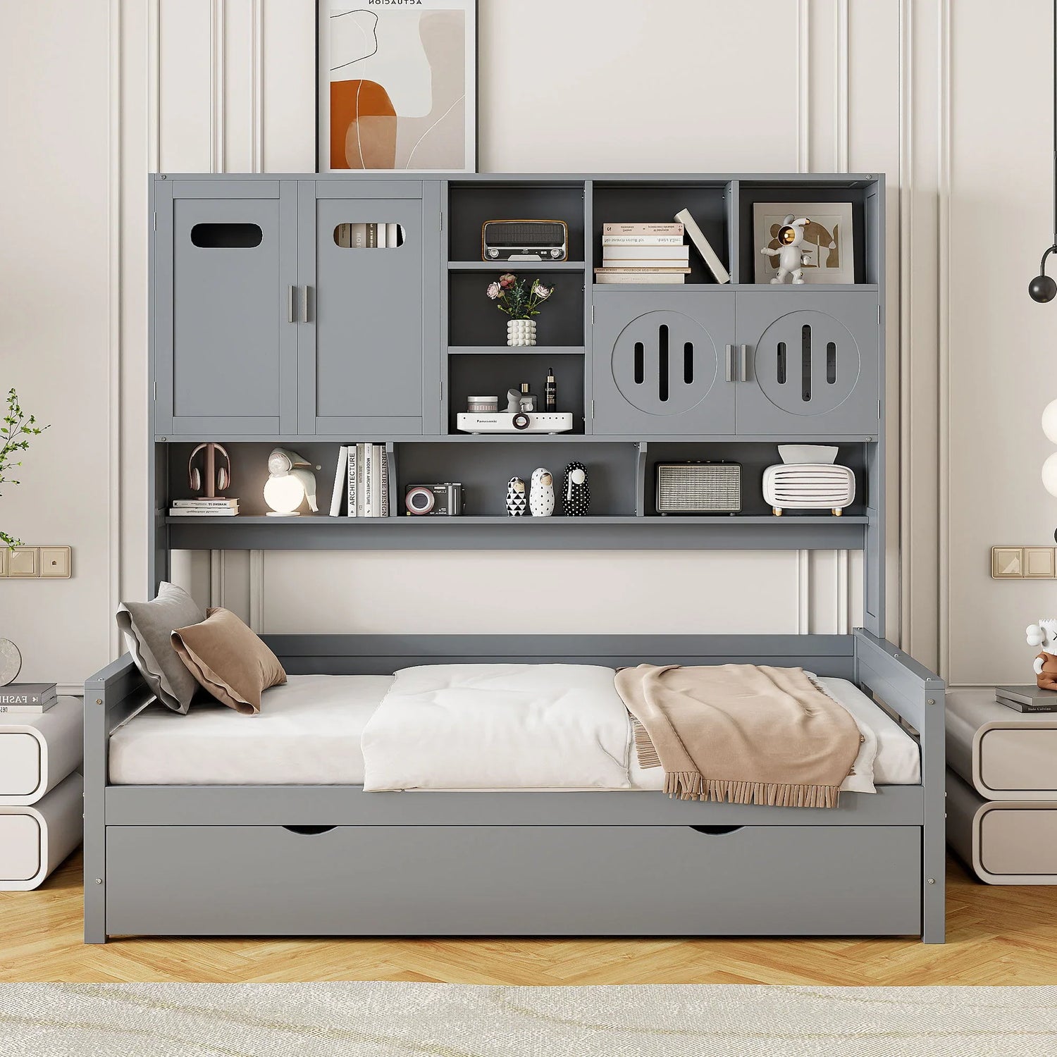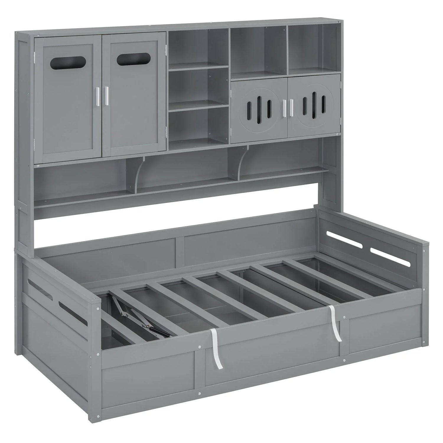 Twin Size Wooden Daybed With Hydraulic Bed And All In One Cabinet And Shelf - Gray