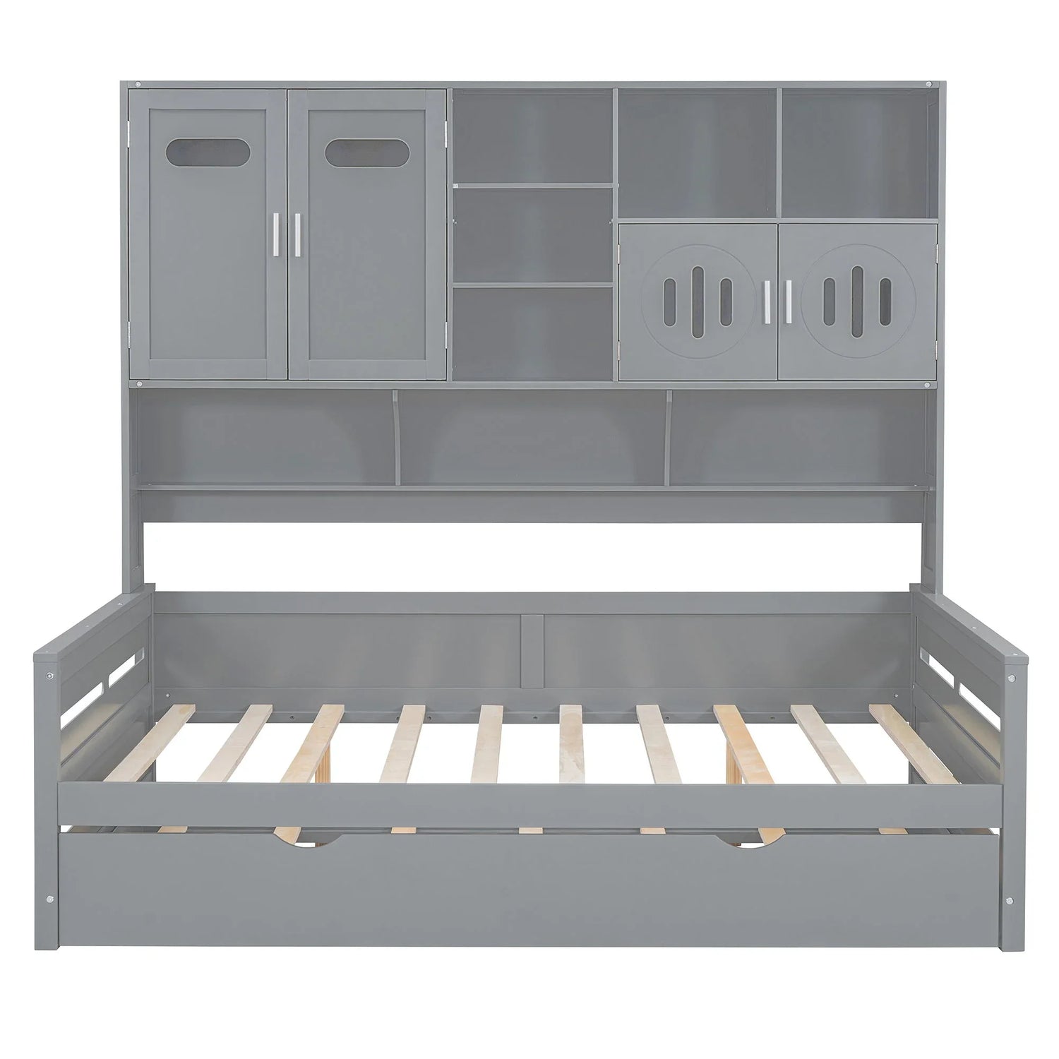 Full Size Wooden Daybed With Twin Size Trundle, And All In One Cabinet And Shelf - Gray