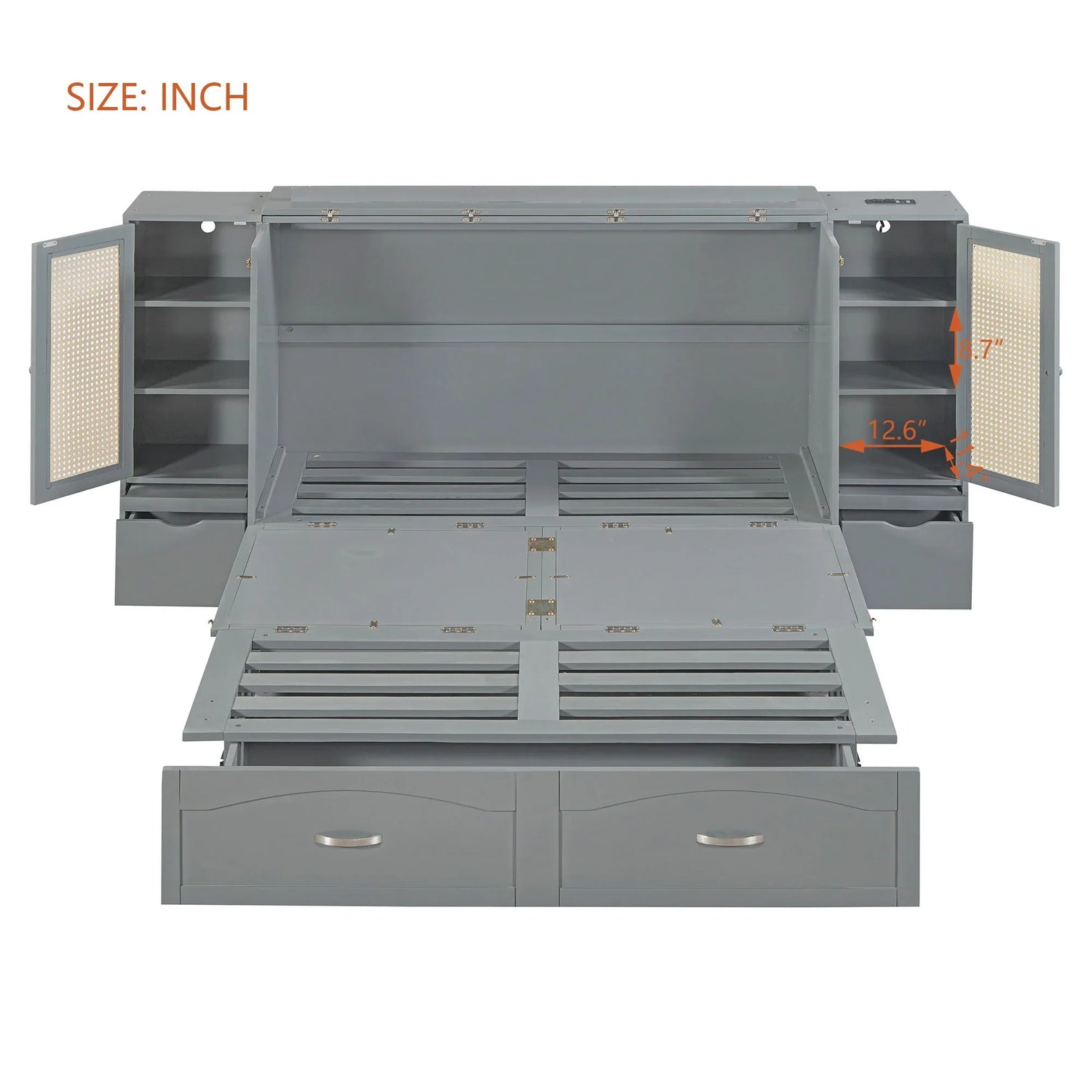 Full Size Murphy Bed With Drawer And Rattan Decoration - Gray