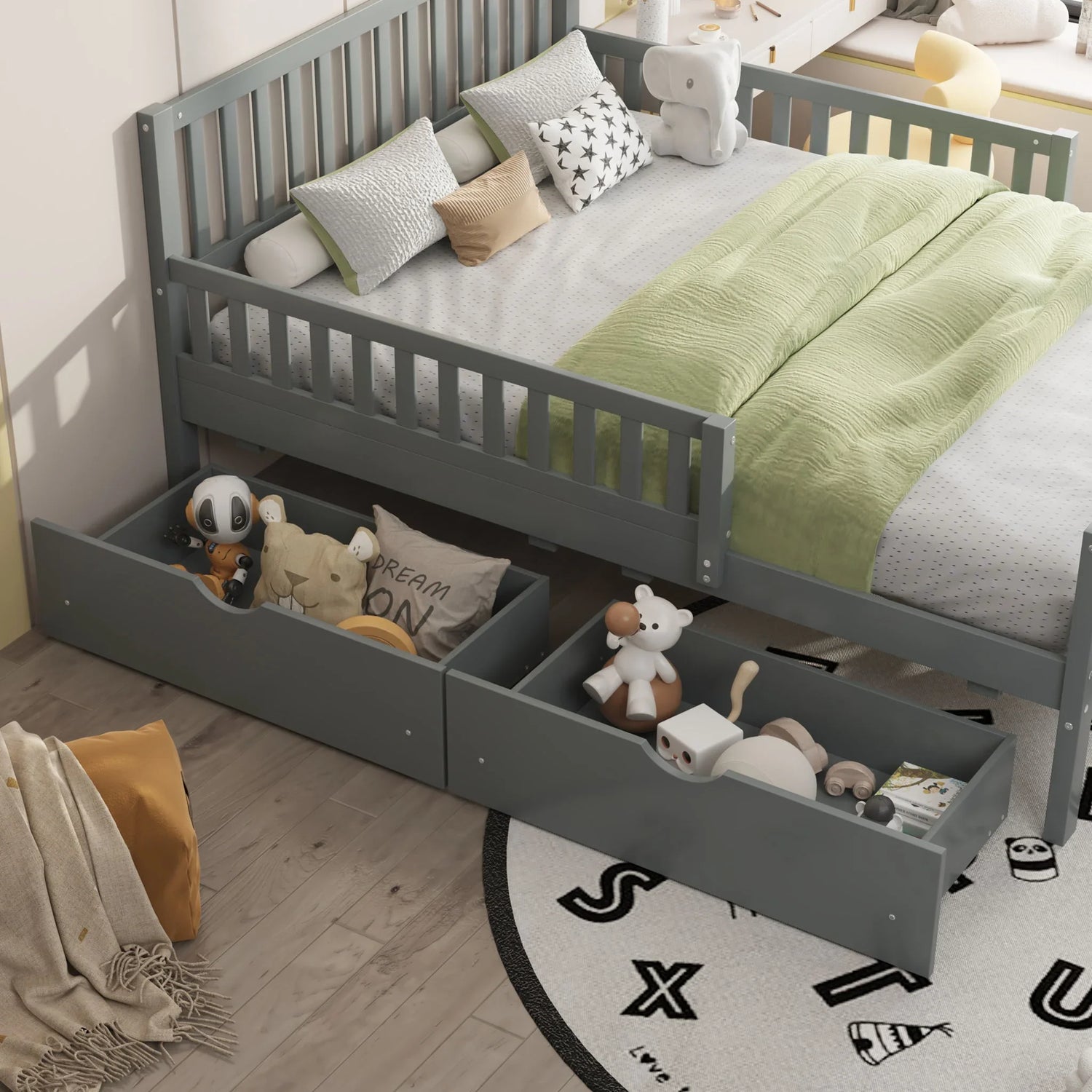 Full Size Platform Bed With Guardrails On Both Sides And 2 Storage Drawers - Gray