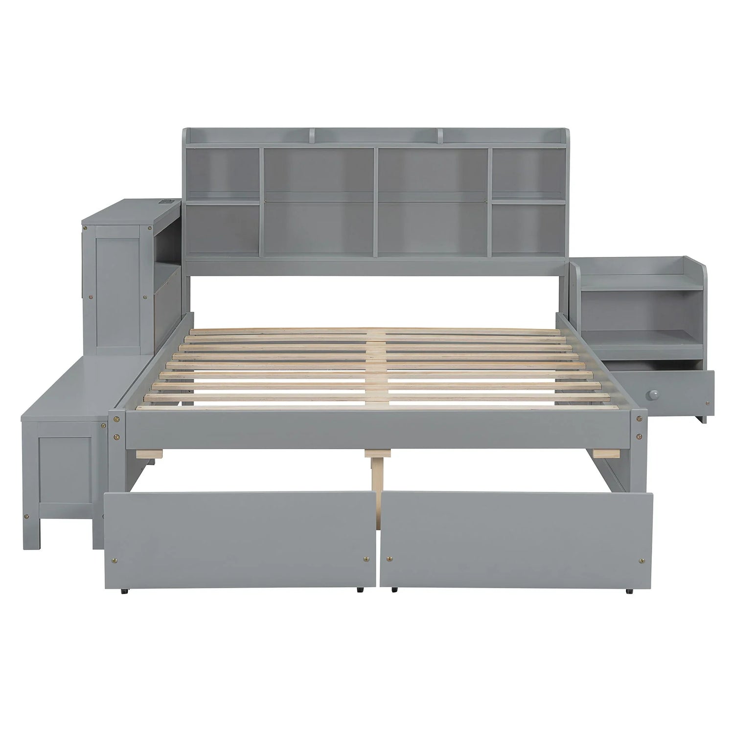 Full Size Platform Bed With Multi Functional Storage Space, Nightstand, 2 Drawers, USB Ports And Desk - Gray