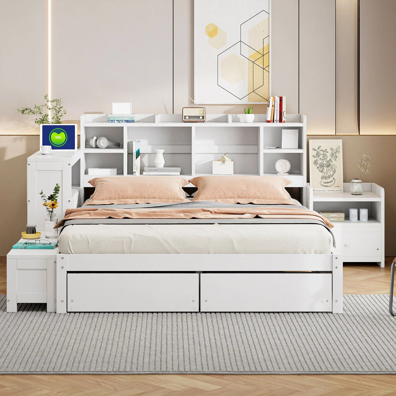 Transform your bedroom with this sleek and functional wooden platform bed, designed to combine style and practicality. Featuring a headboard with multi-size storage compartments for your essentials like clocks, glasses, and phones, this bed keeps your items within easy reach. A built-in desk on the side offers a convenient space for work or study, with a USB charging port to ensure your devices stay powered up. Below the desk, ample storage options are available. The bed also includes a nightstand, and two storage drawers at the foot of the bed to meet all your daily storage needs. With this multi-functional design, enjoy a clutter-free and convenient living space.