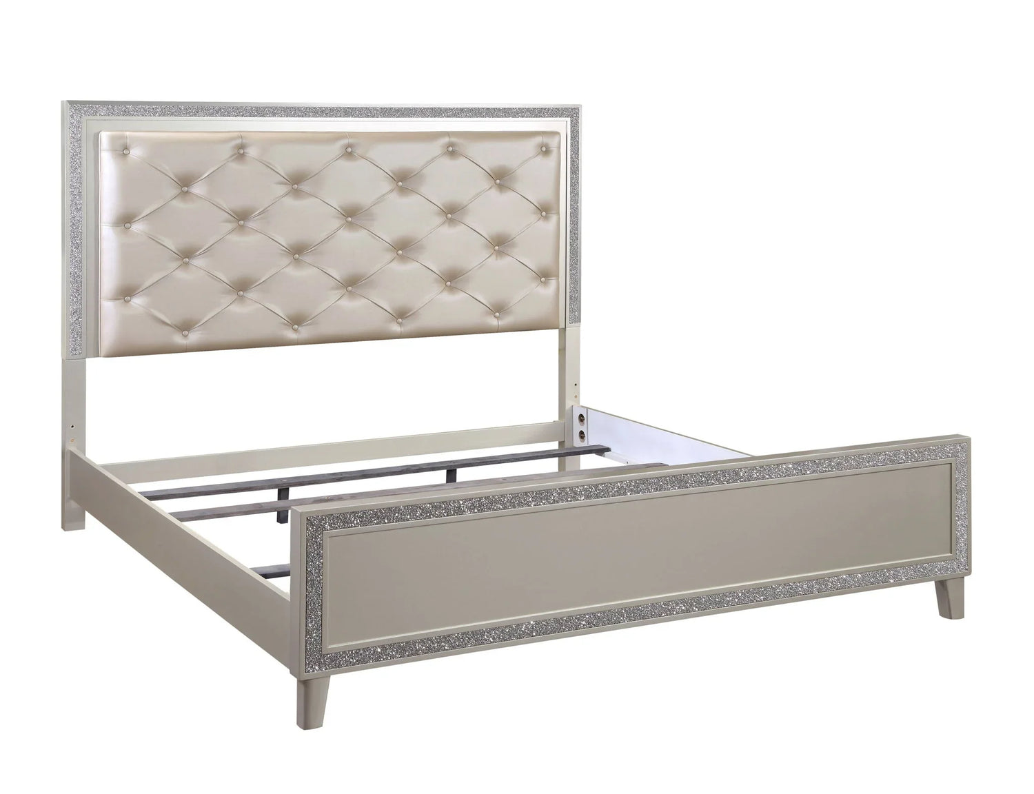 Headboard: Padded, button-tufted headboard with integrated LED lighting and decorative glitter-textured trim.