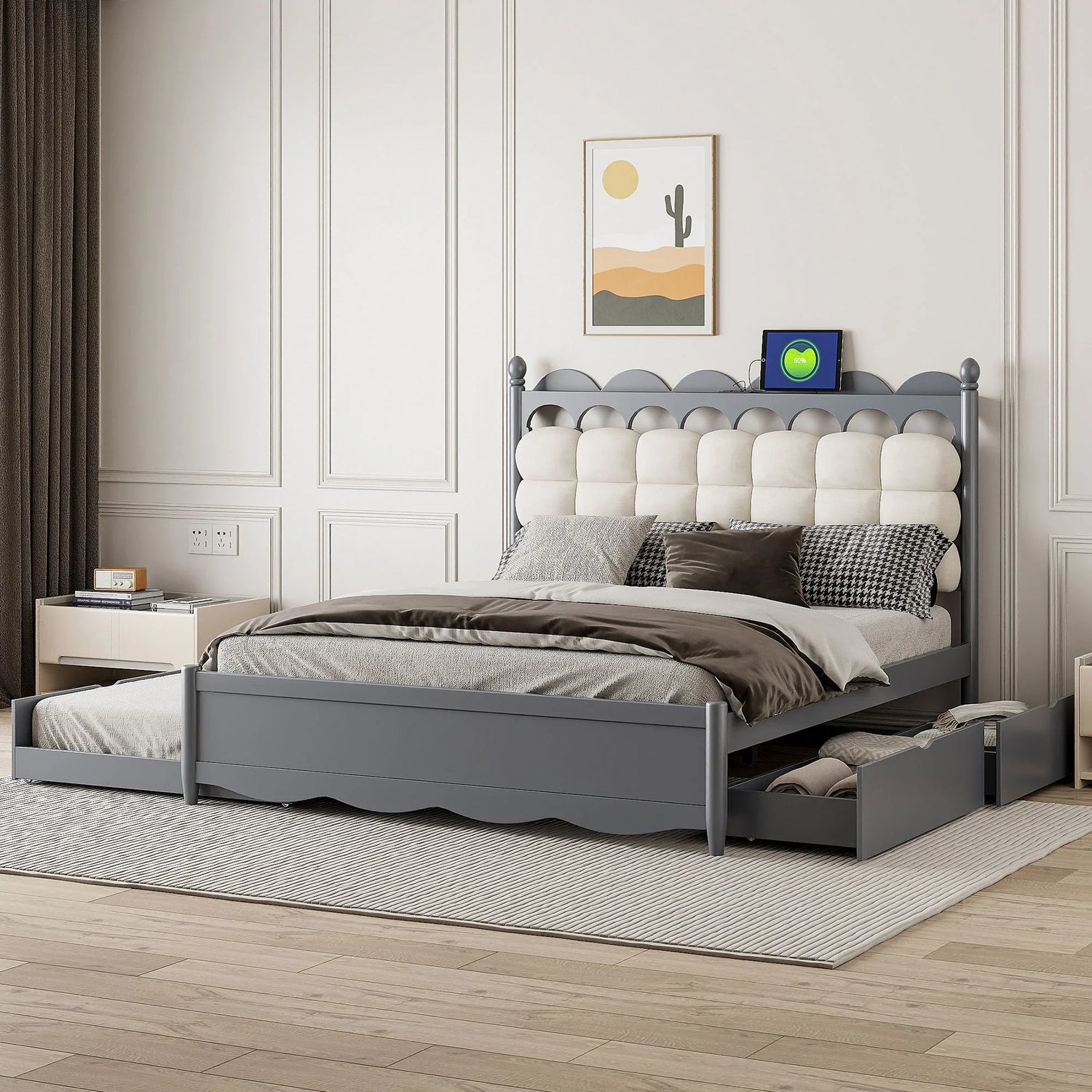 - Includes: Platform bed frame with upholstered headboard, two large under-bed drawers, pull-out trundle, and one set of electrical sockets with USB ports located in the headboard.