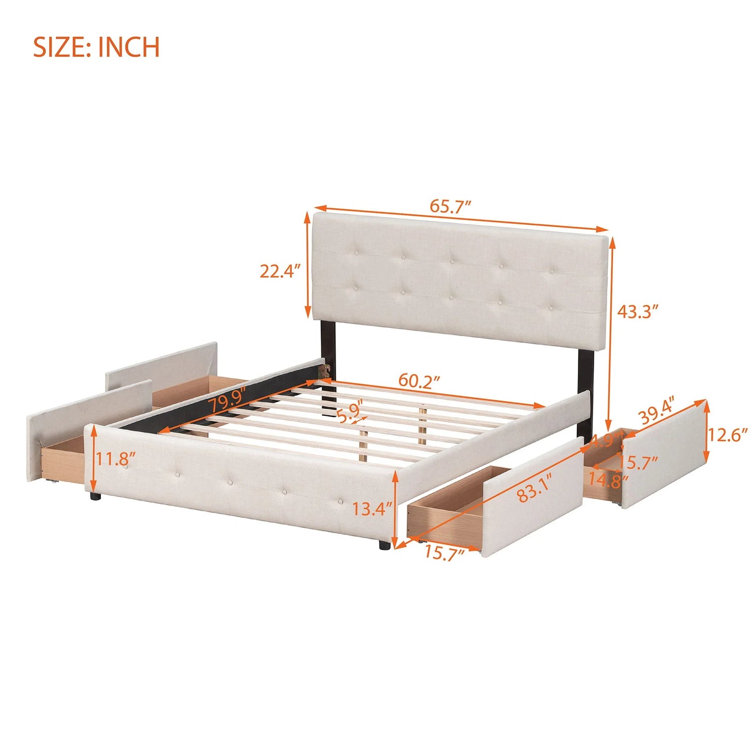 Queen Size Upholstered Platform Bed With Classic Headboard And 4 Drawers, No Box Spring Needed - Beige