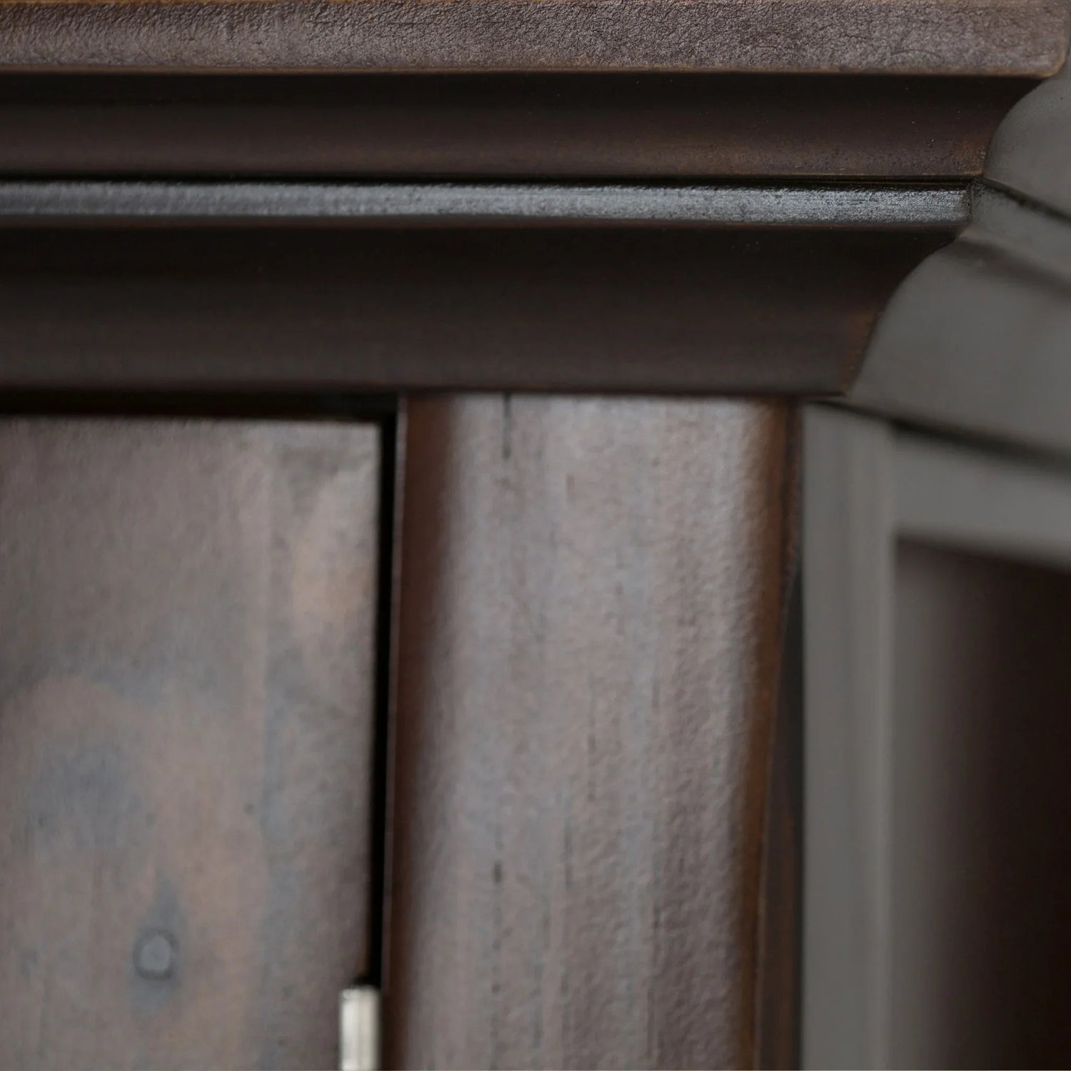 - Features two (2) bottom drawers, two (2) side cabinets with tempered glass doors with one (1) adjustable shelf each