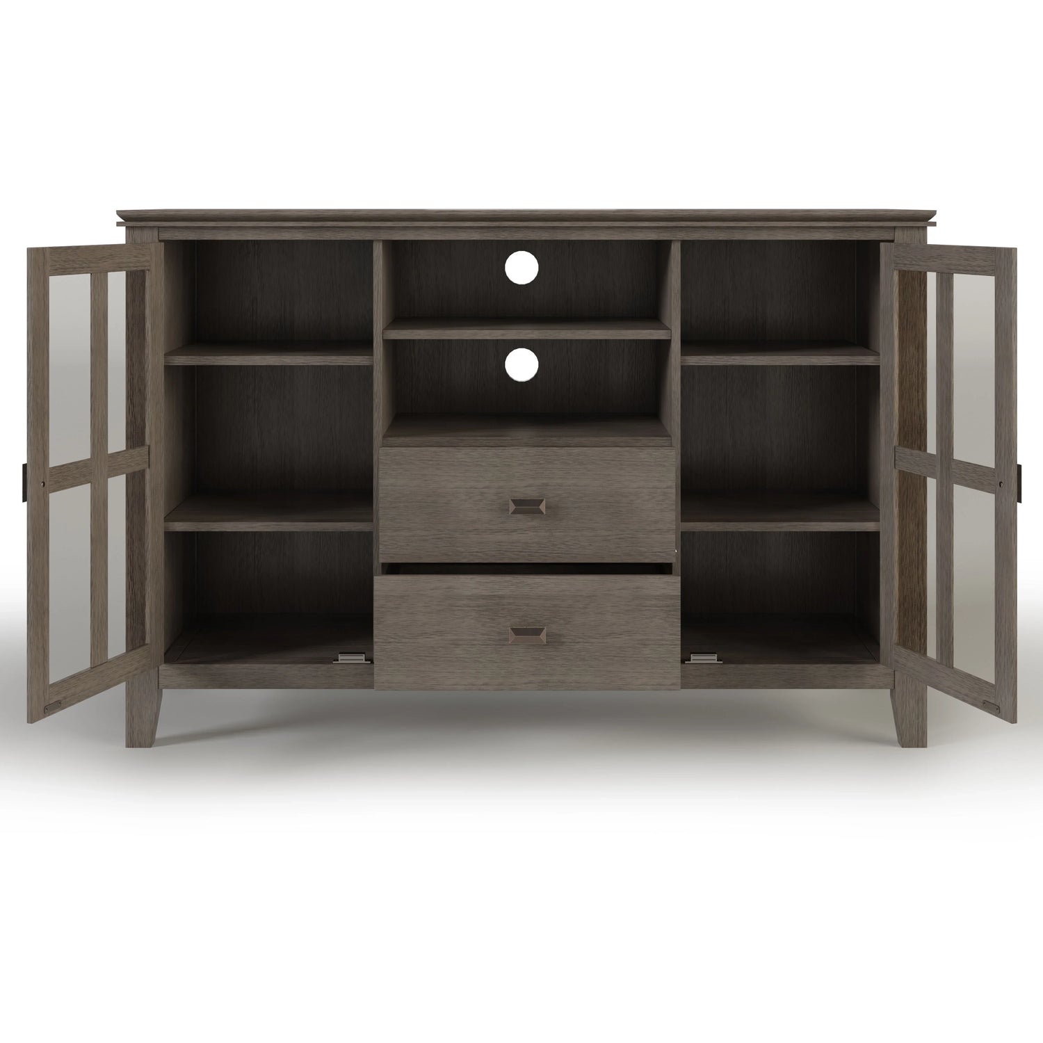 - Features two (2) central drawers with metal glides, open center area with adjustable shelf and two (2) side tempered glass framed doors that open to large storage spaces with two (2) shelves each