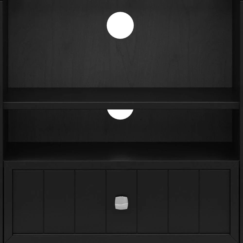 - Features two (2) central drawers with metal glides, open center area with adjustable shelf and two (2) side doors that open to large storage spaces with two (2) shelves each