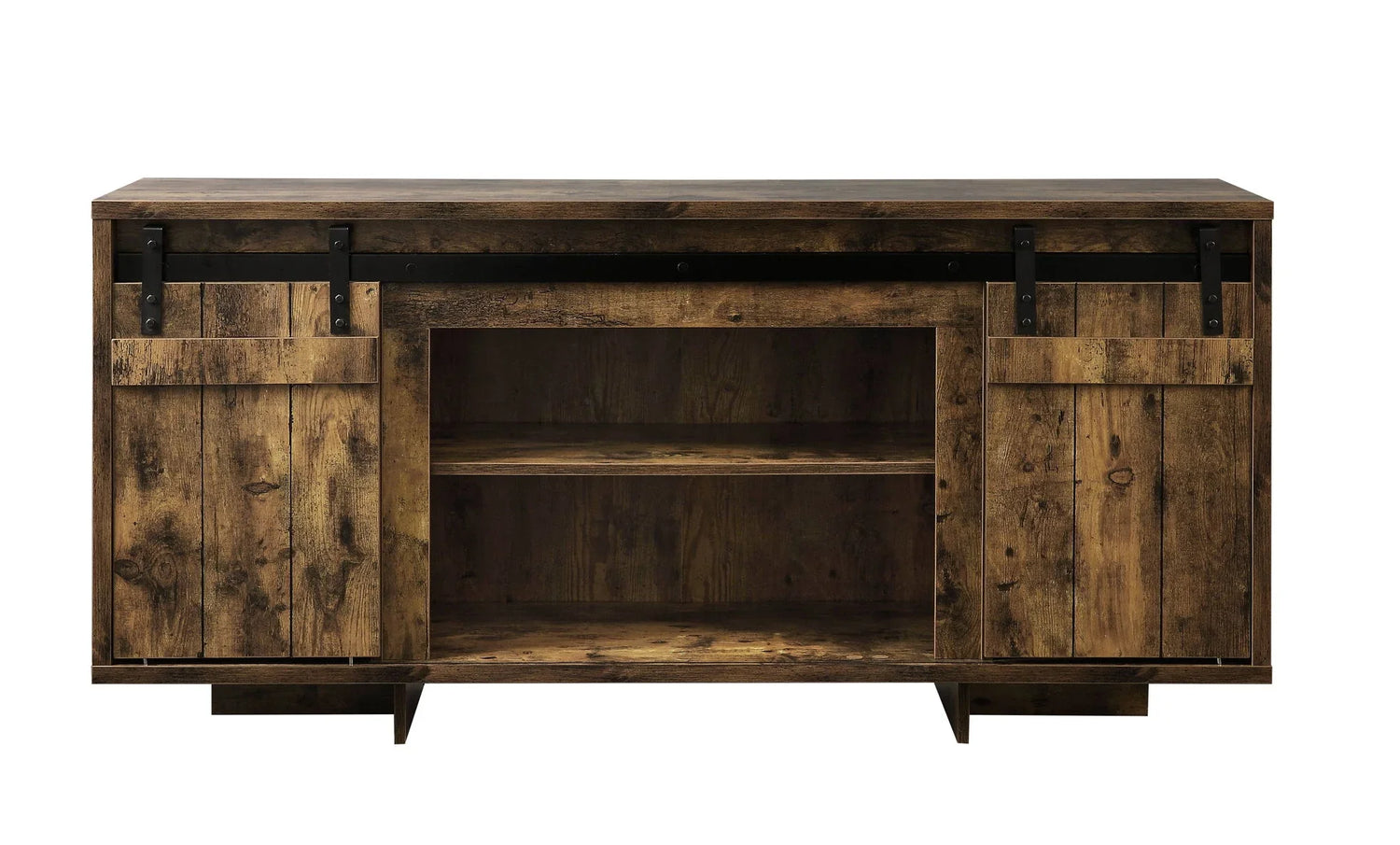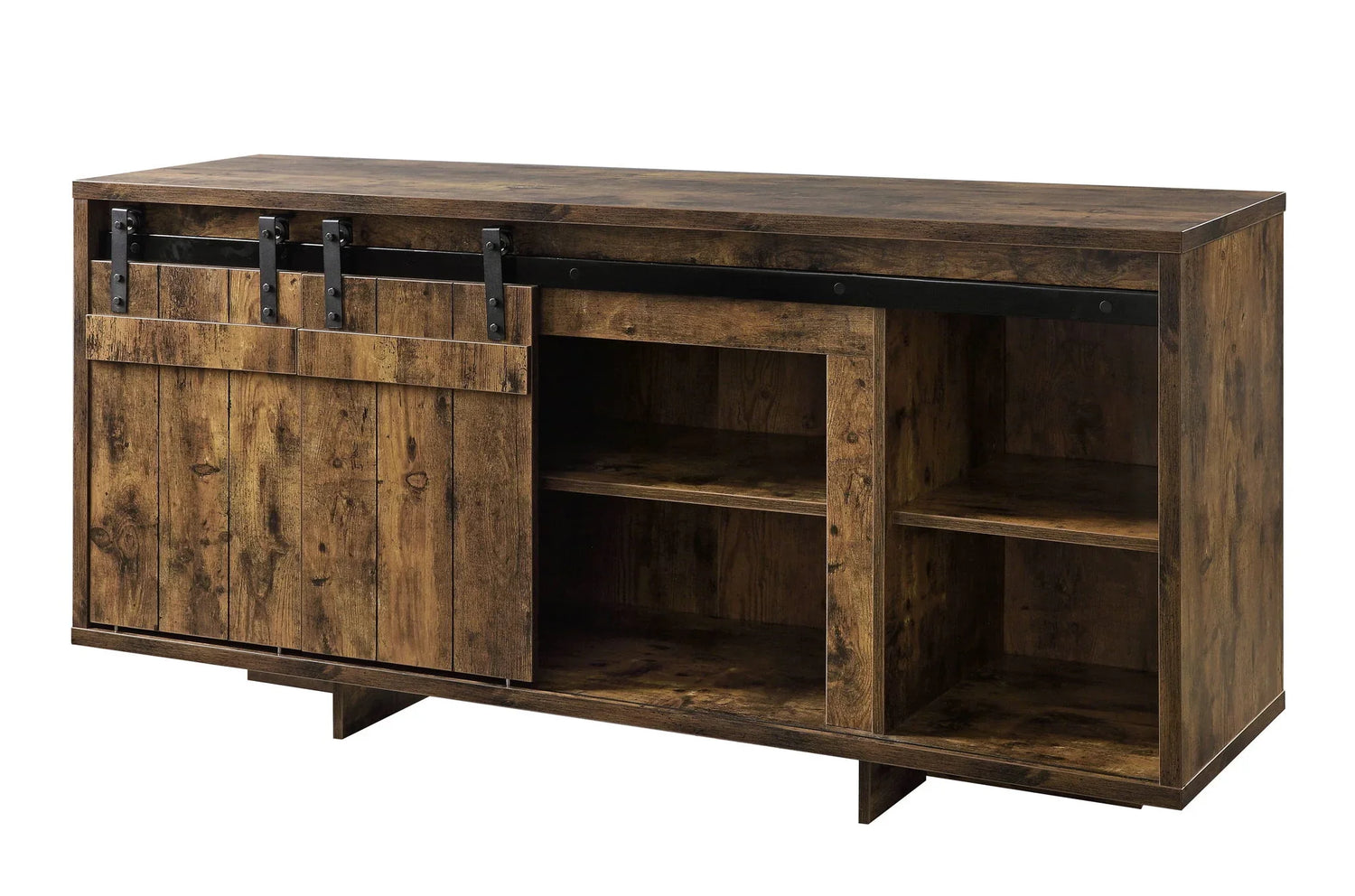 - Design & Functionality: The Bellarosa TV Stand features a rectangular design with a rustic finish, perfect for accommodating a 60-inch flat screen TV. It includes two sliding barn doors and two media compartments for ample storage.