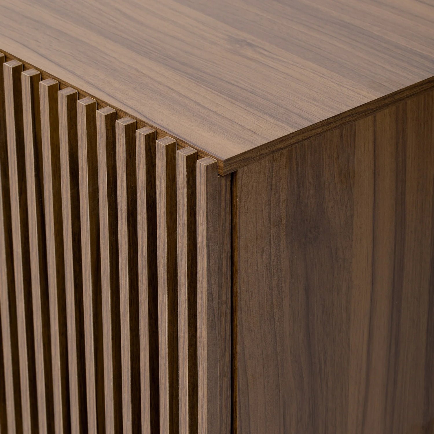 Finish & materials: Walnut wood‑look finish with visible grain; slatted front panel for ventilation; metal gas struts on the drop door. (Exact materials and construction details not provided.)