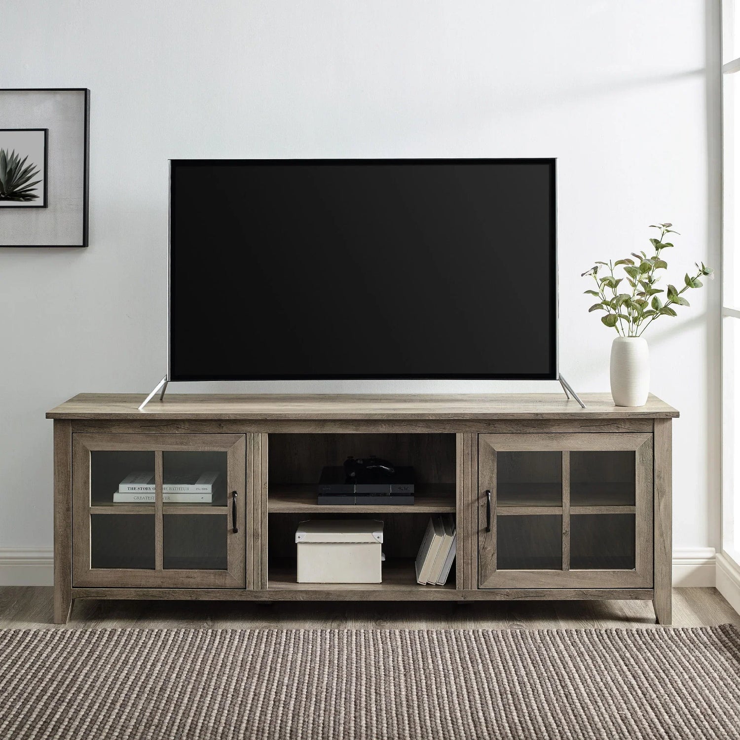 Modern Farmhouse 2 Door Glass Windowpane 70" TV Stand For 80" TVs - Gray Wash