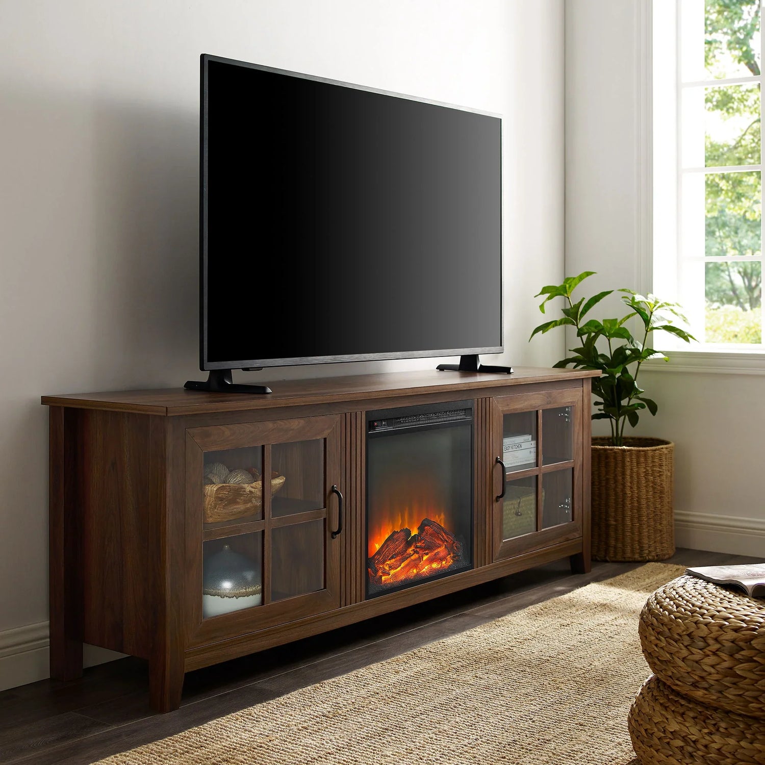 Modern Farmhouse 2 Door Glass Windowpane 70" Fireplace TV Stand For 80" TVs - Dark Walnut