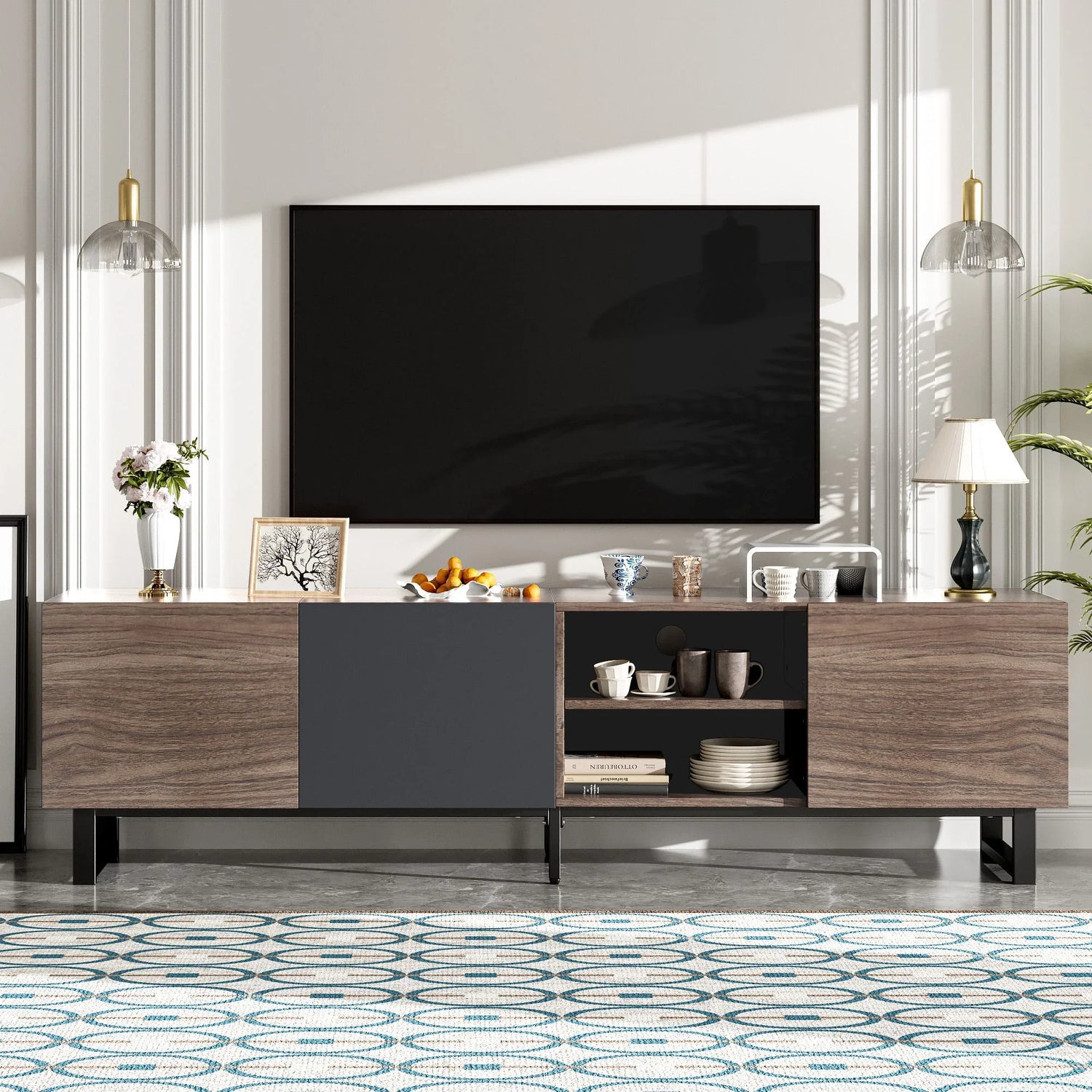 Modern TV With 3 Cabinets & Open Shelves, Color-Matching Media Console Table For Tvs Up To 80'', Entertainment Center With Drop Down Door For Living Room - Dark Brown