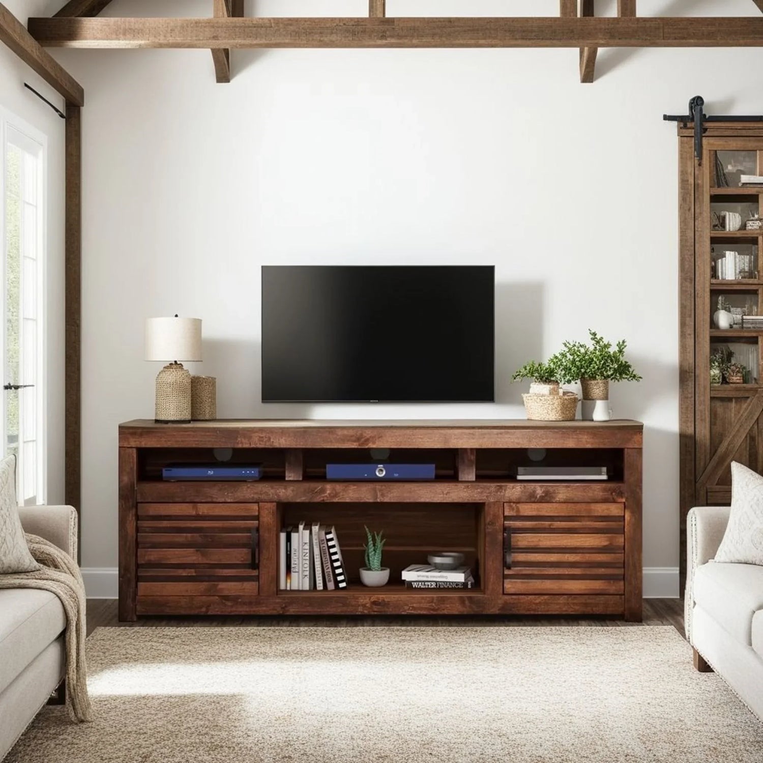The Sausalito Console TV Stand in Whiskey is designed for shoppers who want a warm, lived‑in focal point for a family room or media wall. Built to hold TVs up to 85", it pairs generous surface width with open shelving for components and visible storage that keeps remotes and streaming boxes within easy reach. The knotty alder construction and rich whiskey finish bring rustic character while remaining versatile with modern or farmhouse interiors.