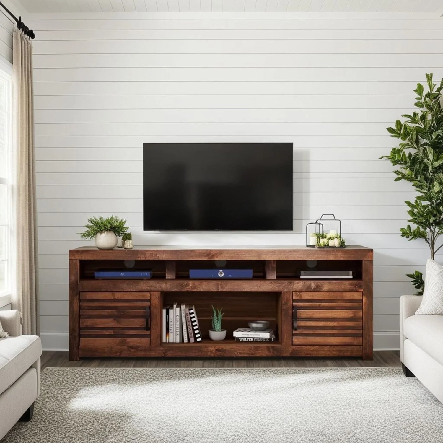 Everyday use is simple: three open cubbies for electronics, two louvered doors for concealed storage, and cable management openings in the rear to keep cords tidy. Flat black hardware and visible wood grain give the piece an artisanal, handcrafted look — and because it ships fully assembled and is made in the USA, you get the look and solidity right out of the box.