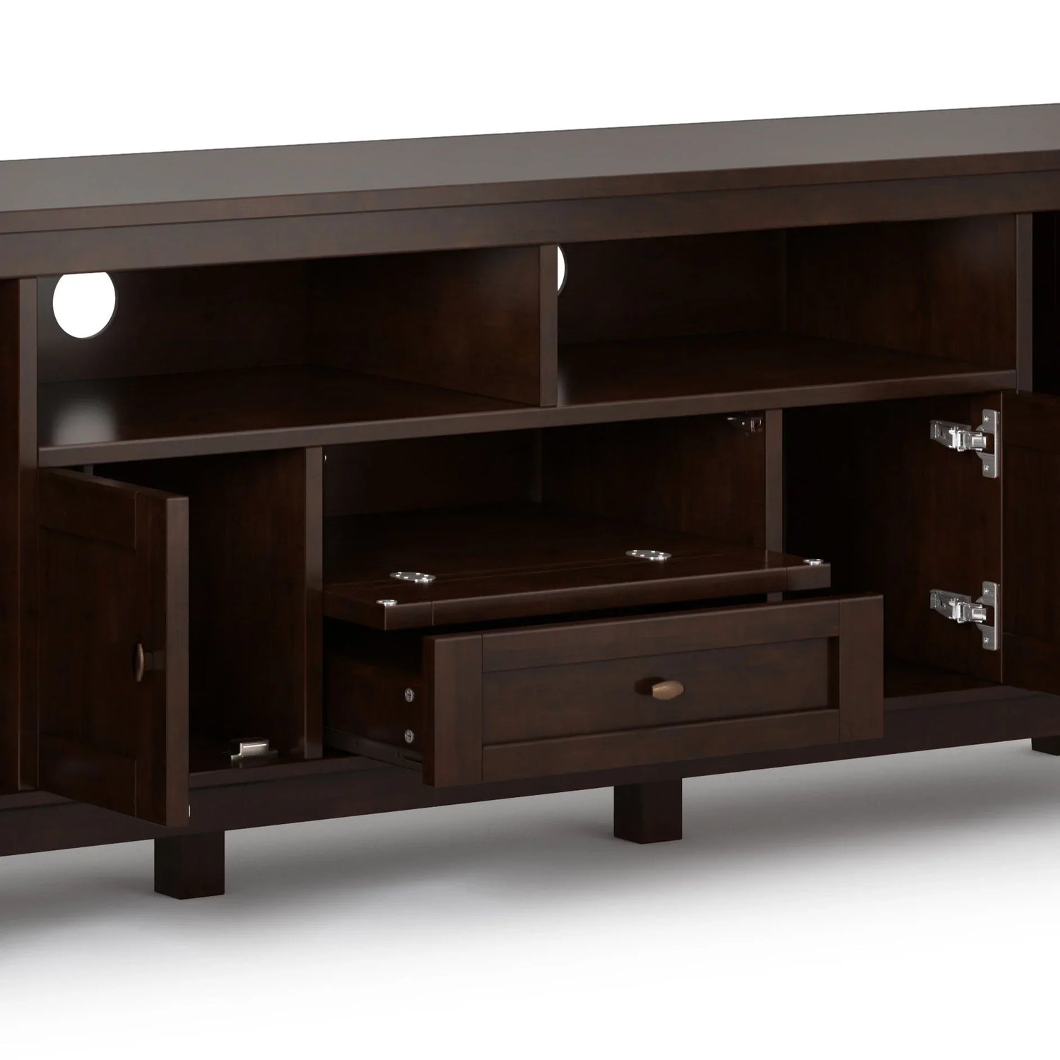 Made from solid wood and finished to show natural grain—expect natural variation across pieces. For electronics safety and to prevent tipping, secure the media stand to the wall with an anti‑tip restraint (recommended for all media furniture). Follow component ventilation best practices and avoid blocking open media shelf airflow.