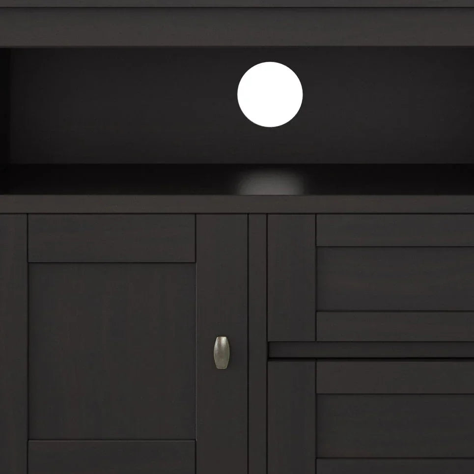 This piece is made from solid wood; natural grain variation is part of the product’s character. If installed with electronics or tall displays nearby, use an approved anti-tip restraint (recommended) and follow local safety guidance for securing furniture. Allow adequate ventilation for AV equipment in the open shelf area.