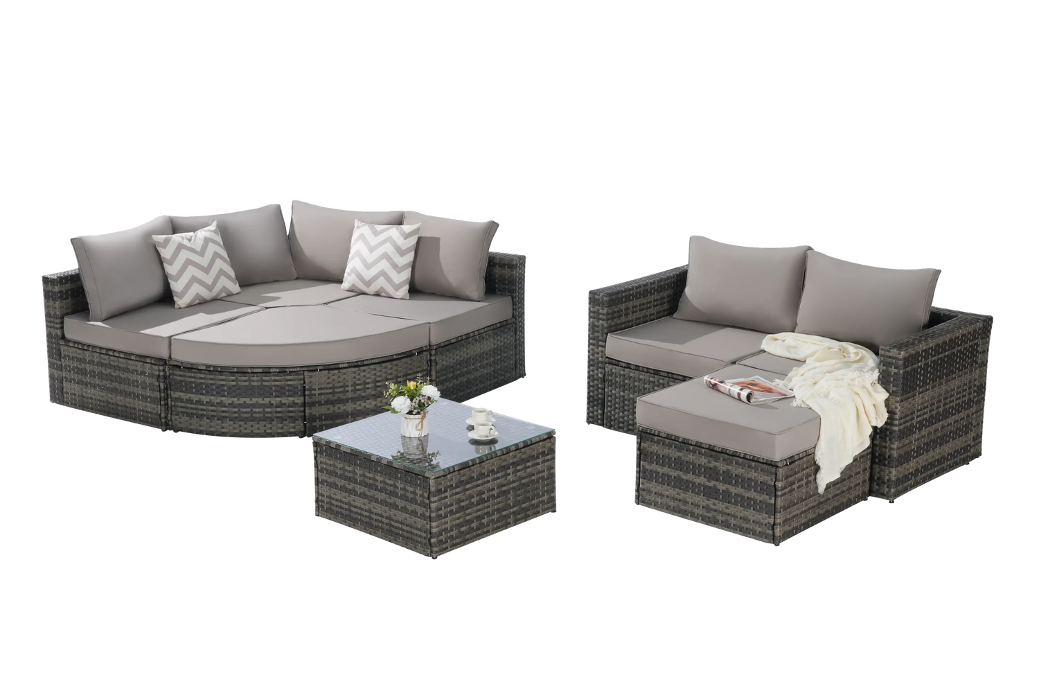 Wicker Outdoor Sectional Set with Curved Ottoman & Glass Top Table