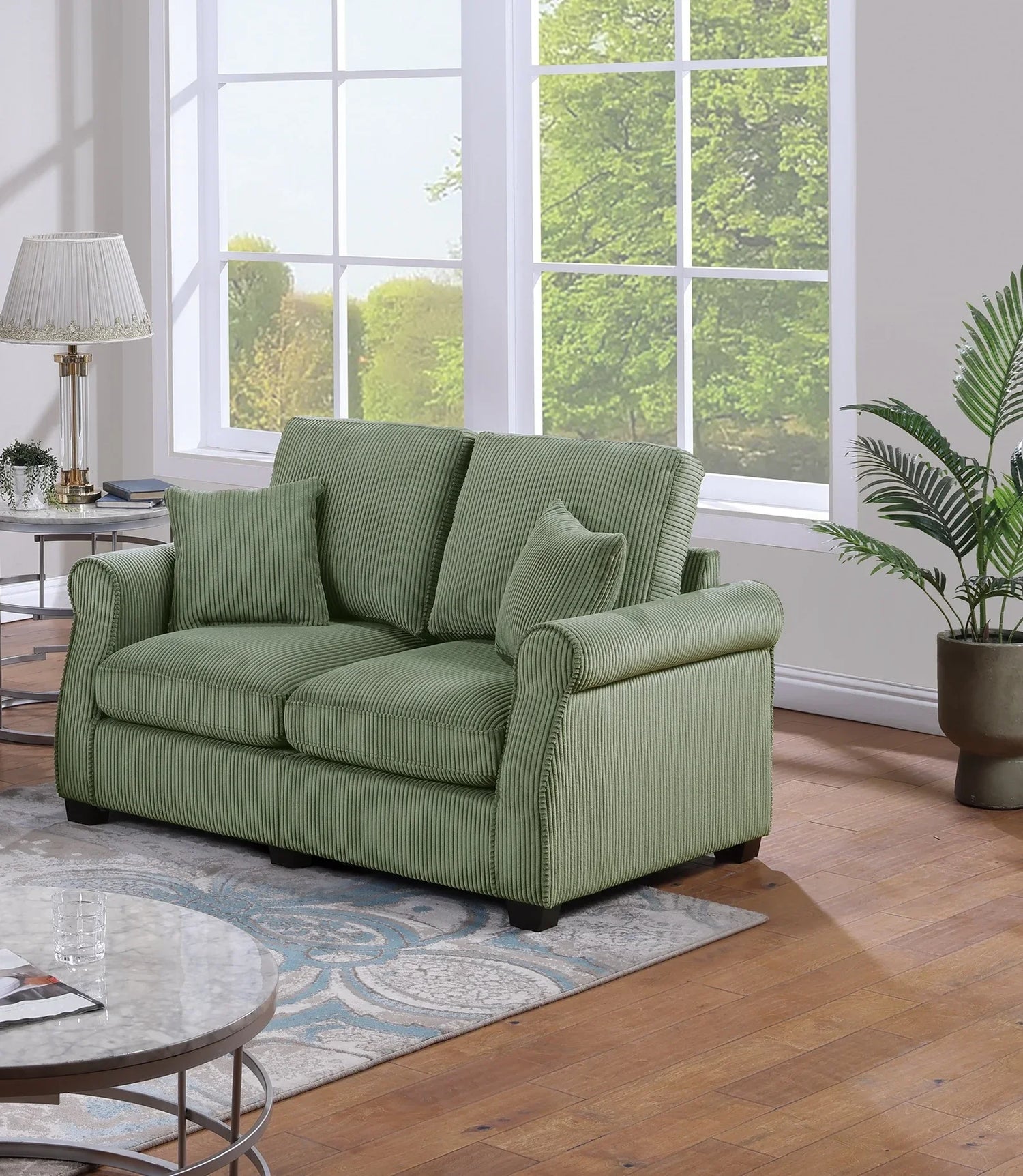 Designed for everyday living rooms where comfort and classic style meet modern ease, this 2-piece living room set pairs a sofa and matching loveseat upholstered in soft sage corduroy. It’s a strong choice for families or anyone who wants a cozy seating group that blends contemporary lines with traditional rolled arms—great for conversation areas, TV rooms, or a relaxed reading corner.